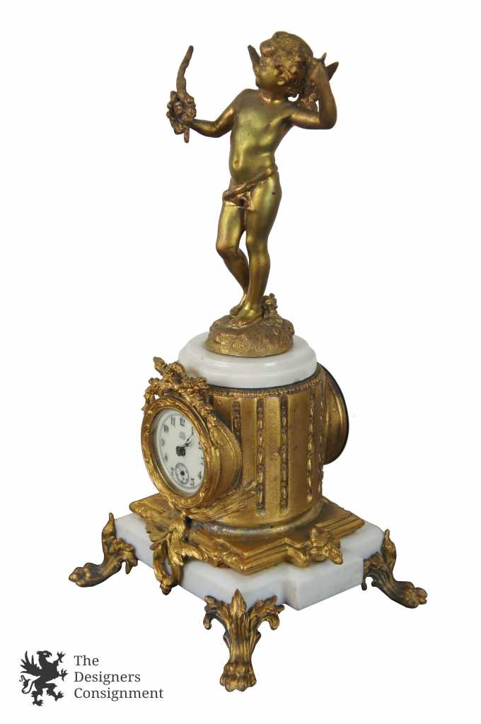 The clock features a gilt cylindrical design with putti centered on top of a piece of bakelite. The base is marble with paw feet.