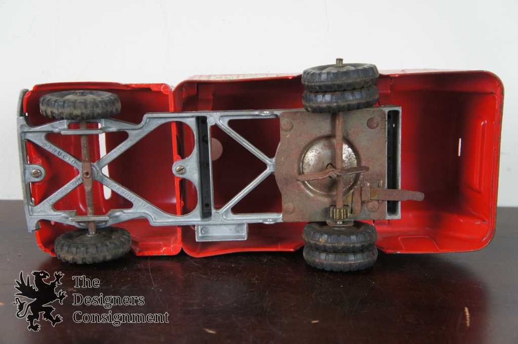 General use related wear. Some paint loss and pitting from age. The wind up mechanism could use some oiling. The truck will roll if you give it a little bit of a push.