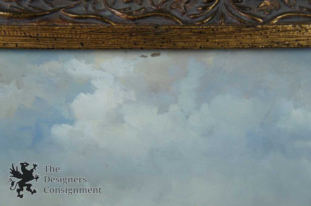 A Dutch inspired oil painting on board. Sheep can be seen grazing the pastures on an overcast day. A woman watches from a far several hundred yards from her cottage. Beautifully executed with vibrant color. Professionally framed in black and gold.