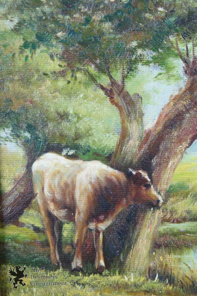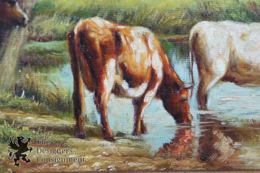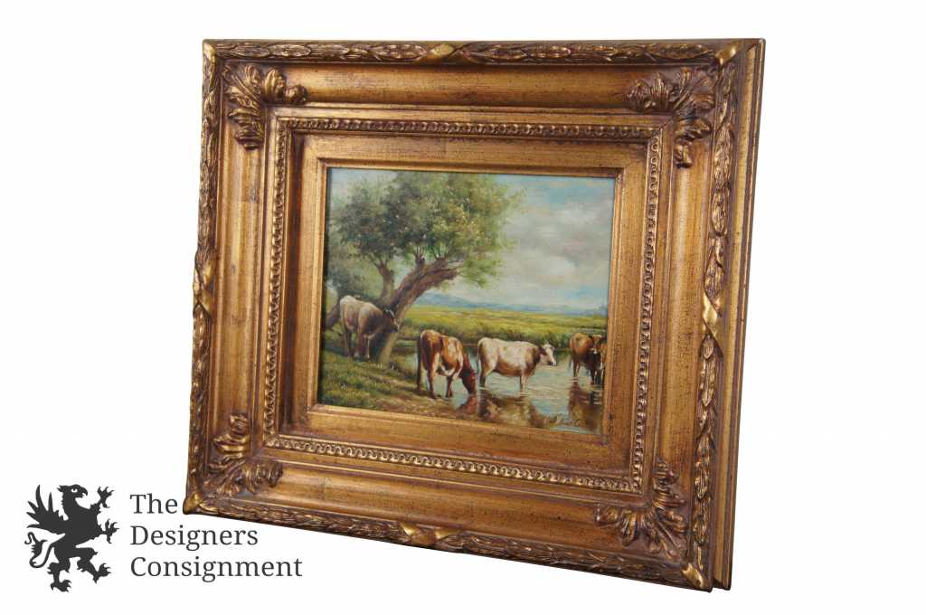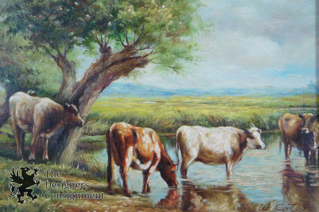 An oil painting on canvas of cows by artist W. Coter. This Impressionist style painting depicts a herd of cows clustered by a watering hole. To the lower right corner of the composition is an artist signature. The painting is presented in a textured gold tone wooden frame in French styling.