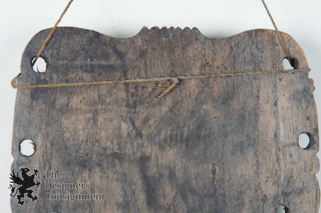 Beautifully engraved bovine calendar. Hangs from carved wooden plaque with hut. Marked Danau Toba from Lake Toba, Indonesia.