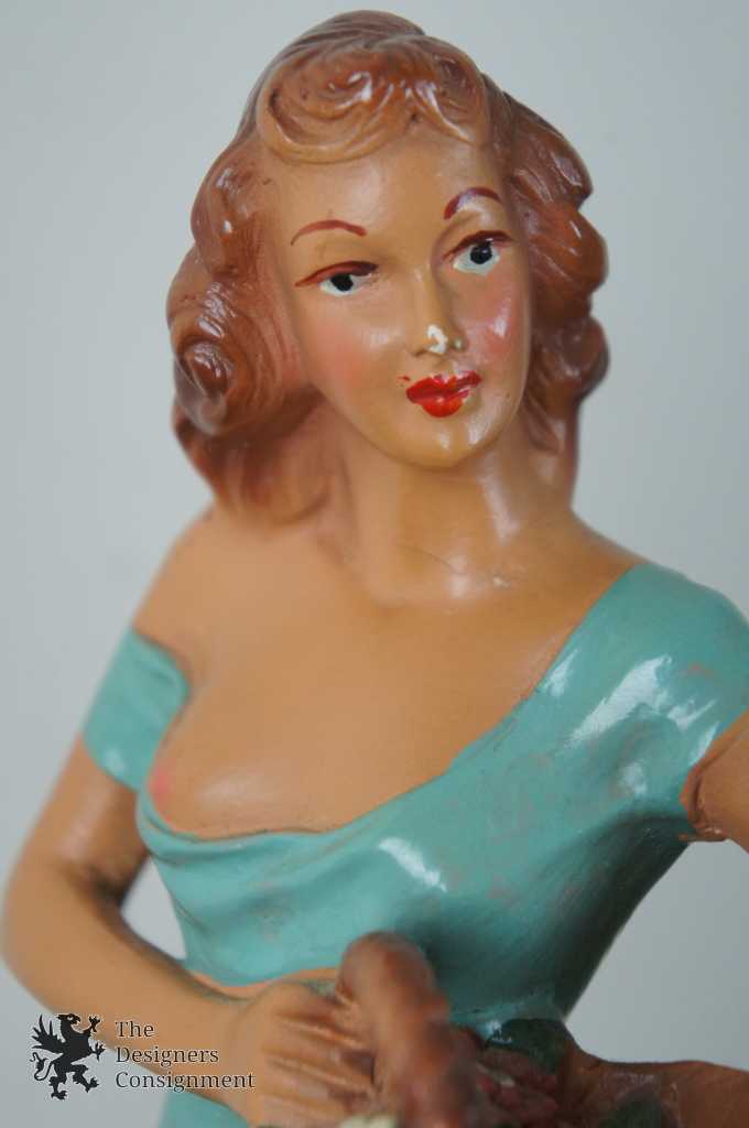 Up for consideration are 2 Universal Statuary Corp figures. Features women in a low cut dress holding flower baskets. Each figure is revealing a nipple. Made from chalkware with elaborate detail.