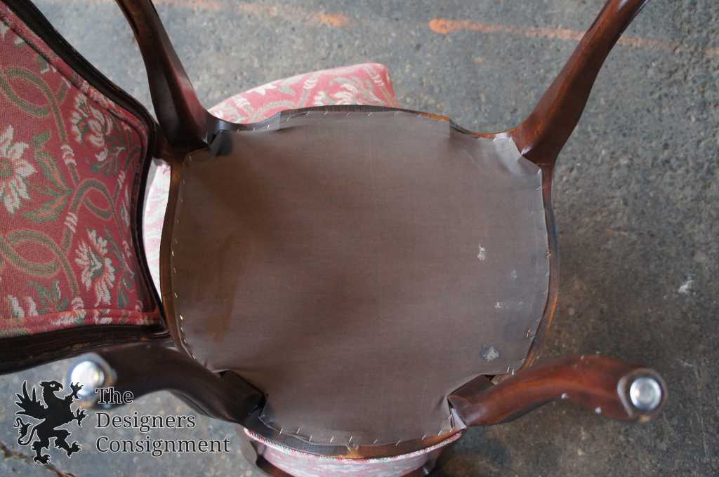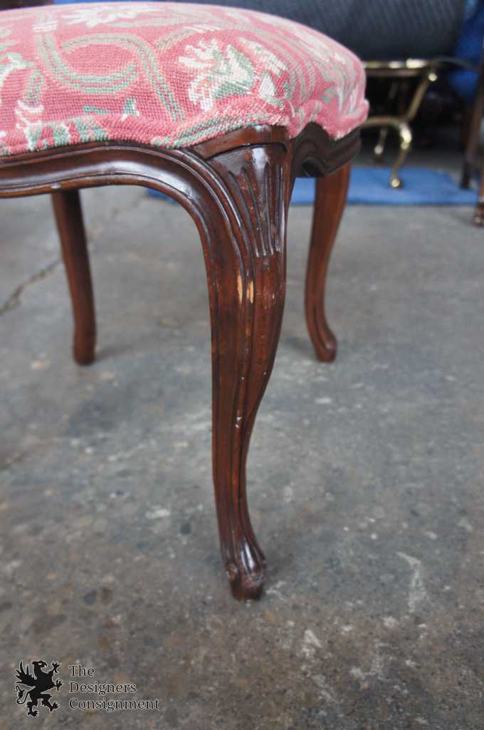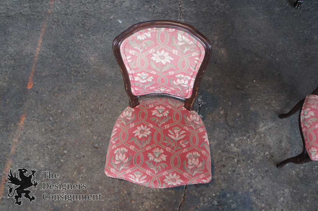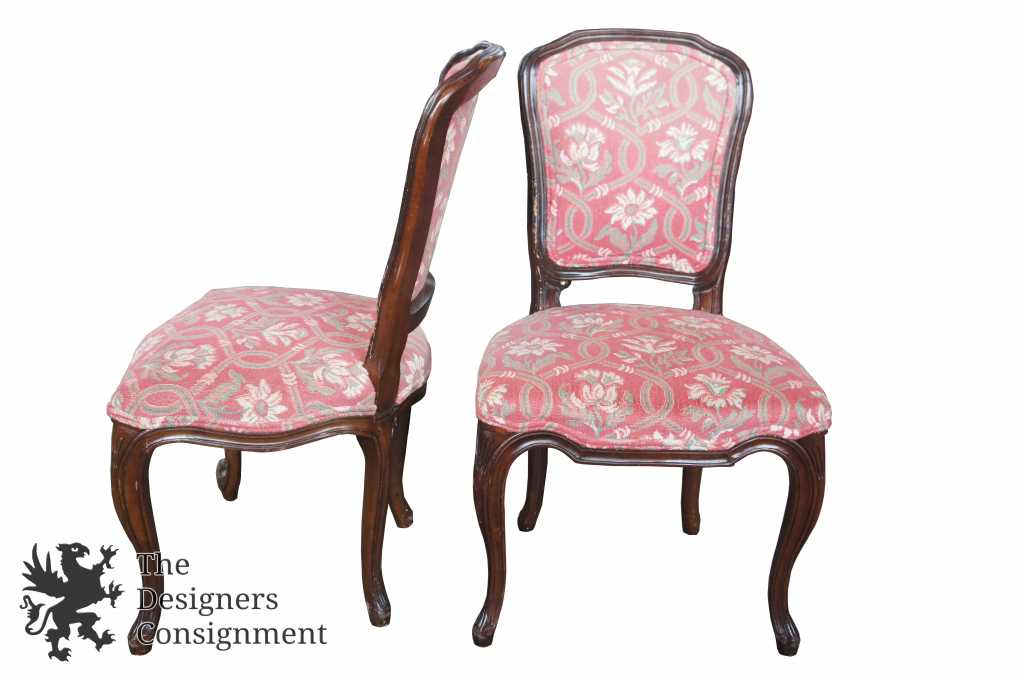Up for consideration are 8 French dining chairs. Circa mid 20th century. Made from walnut with pink and green intertwined floral upholstery. Features cabriole legs and carved accents. A neat addition to any setting.