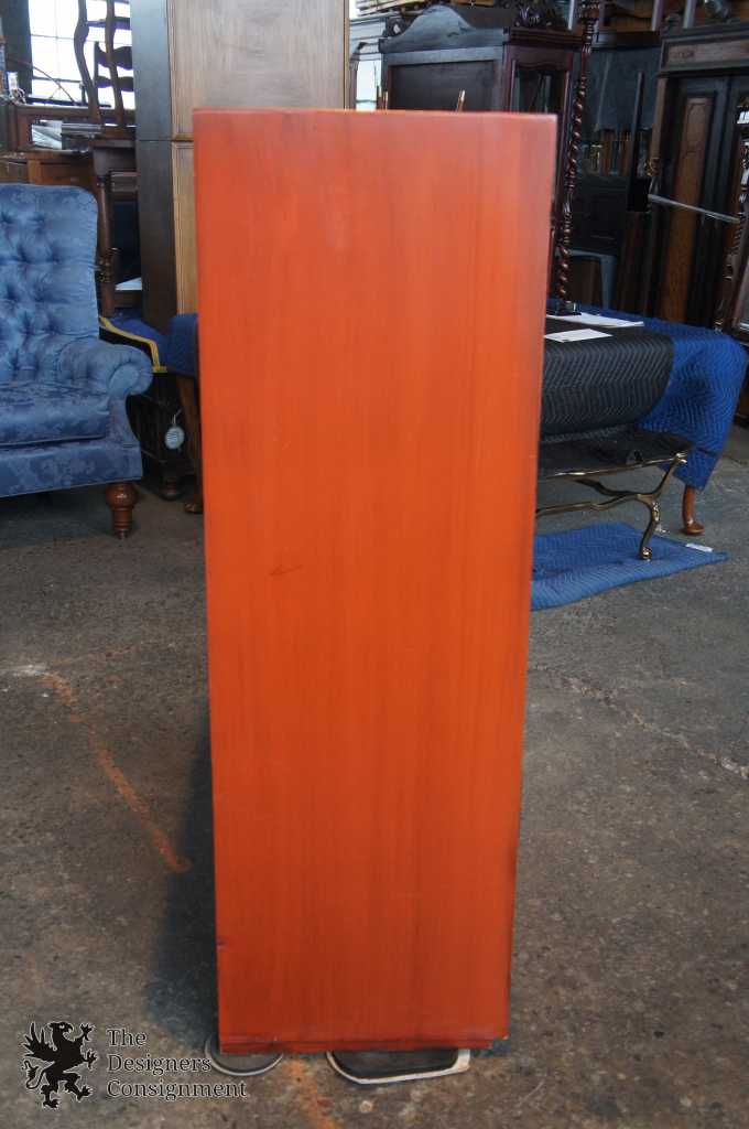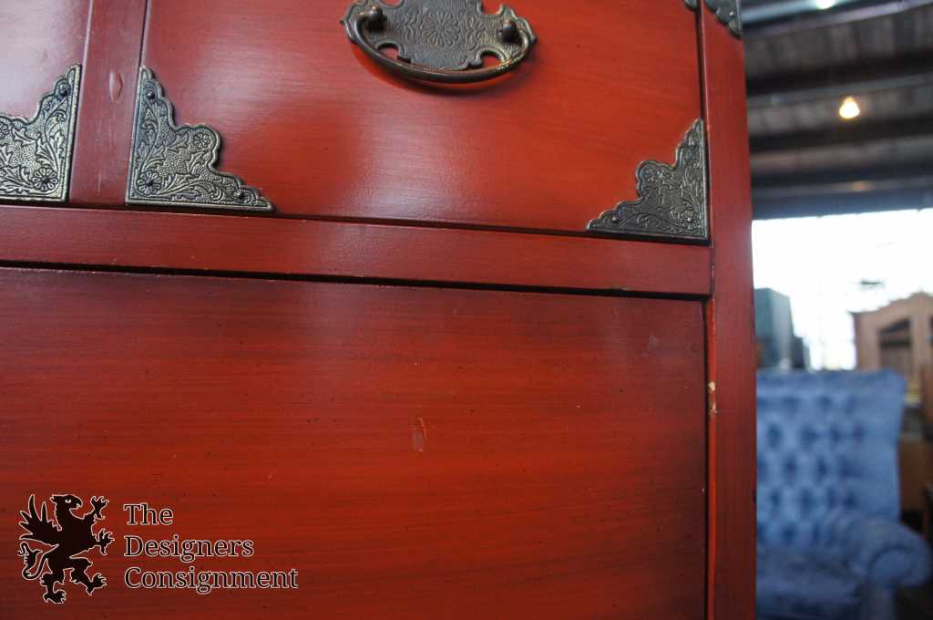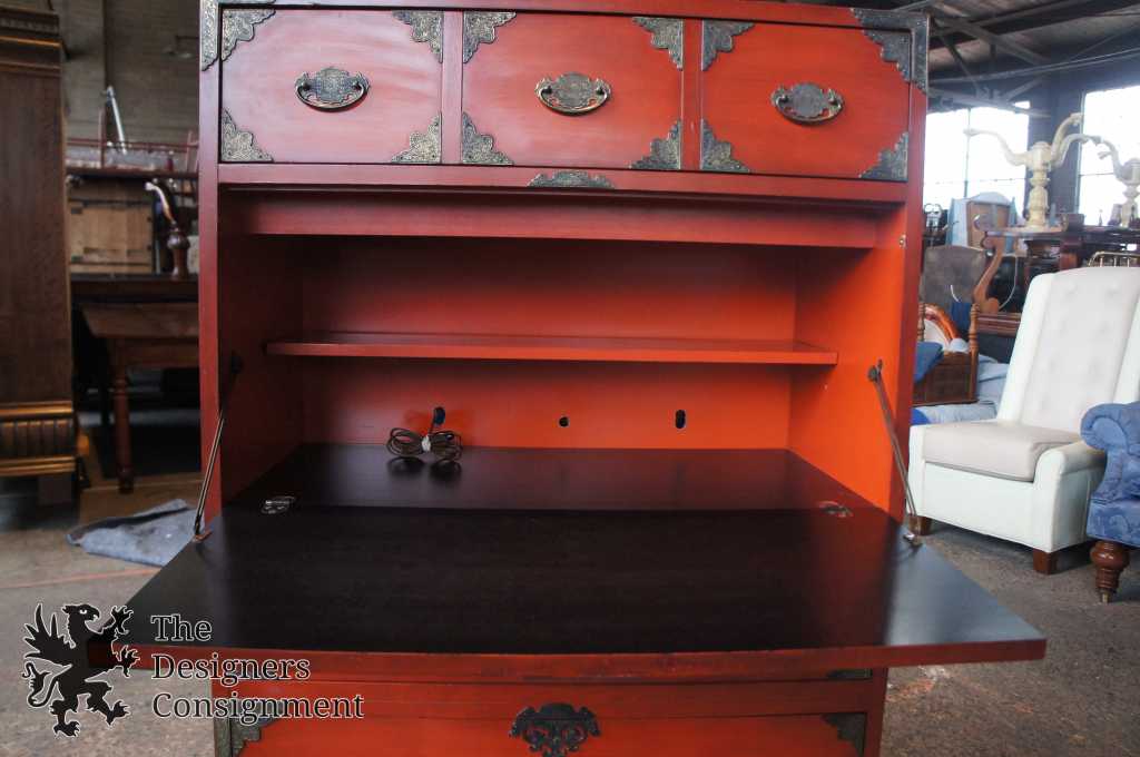 A gorgeous secretary desk from Thomasville's Passport collection. #2556-320. The passport collection was inspired from historic furniture from around the world. The beautiful chest features a Japanese Tansu inspired design with drop front writing surface. The cabinet is finished in a bold red-orange color with brass hardware. Includes 4 drawers, interior light and shelf. The black writing surface is both durable and stain resistant.