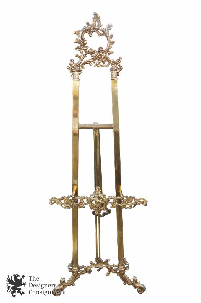 Baroque style brass easel. Perfect for display in any setting. Ornately designed with rococo decorated finial, base, art holder and kickstand. Nicely weighted allowing it to withstand any piece. (Artwork in the picture is not included)