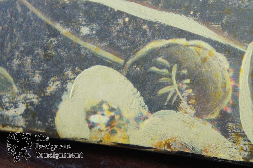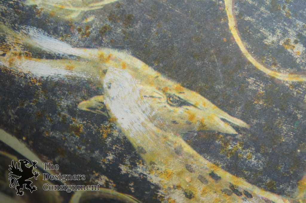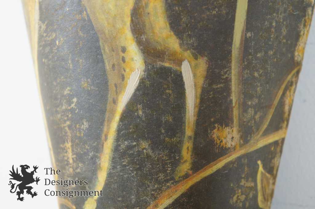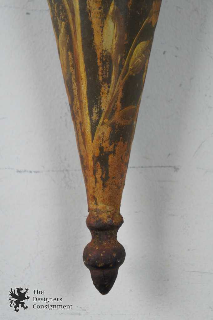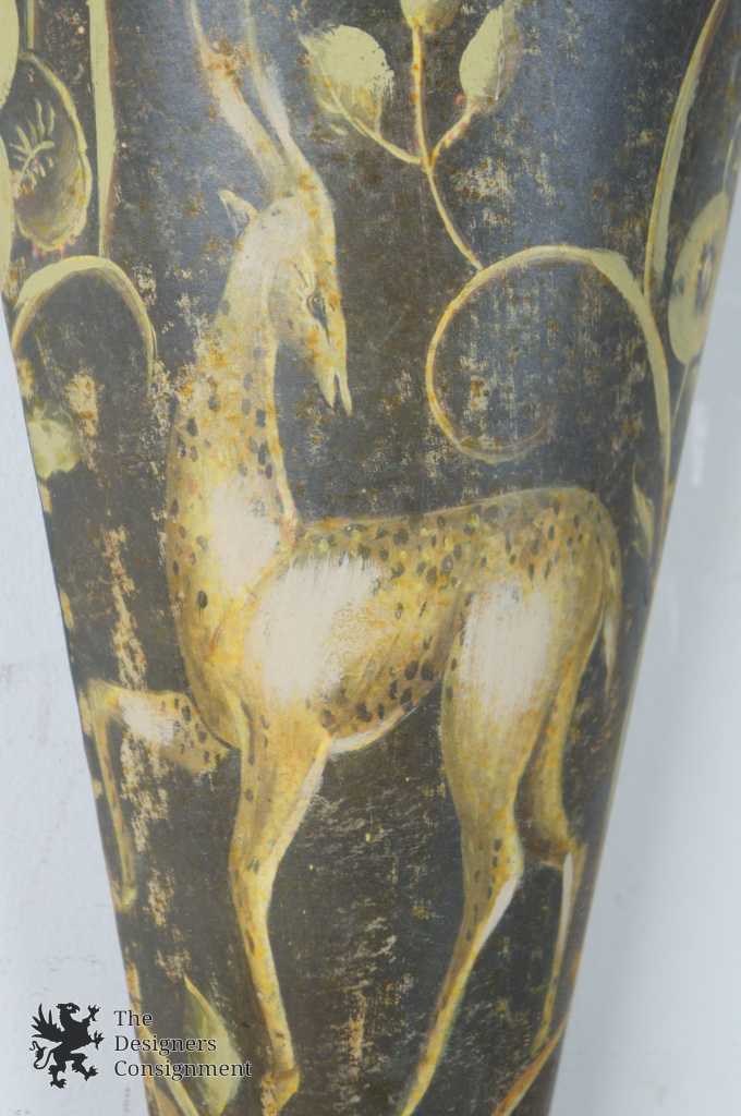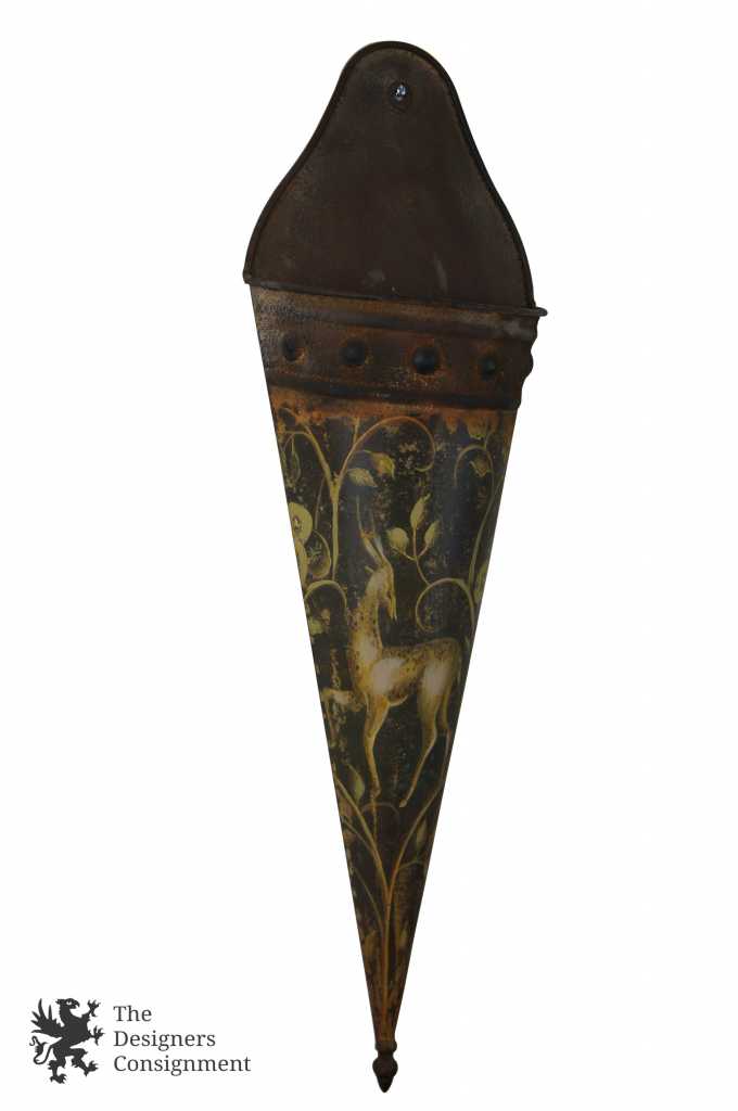 Up for consideration is a neat rustic wall sconce. Made from metal with an antiqued finish. A stag or antelope is painted along the front amongst a forest setting. The piece tapers from top to bottom to an acorn finial. A neat addition to any setting.