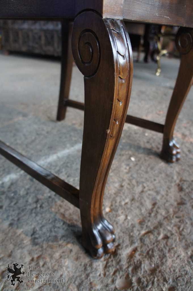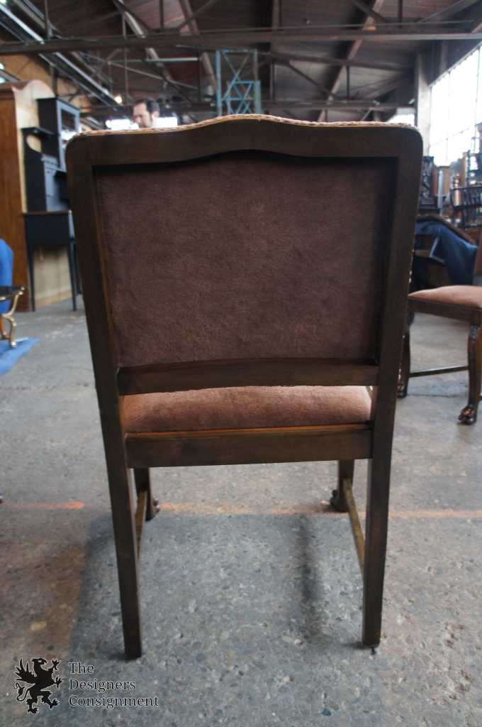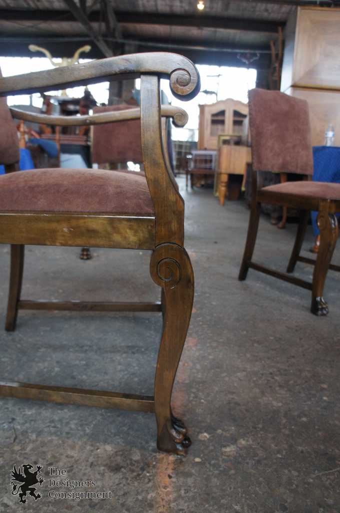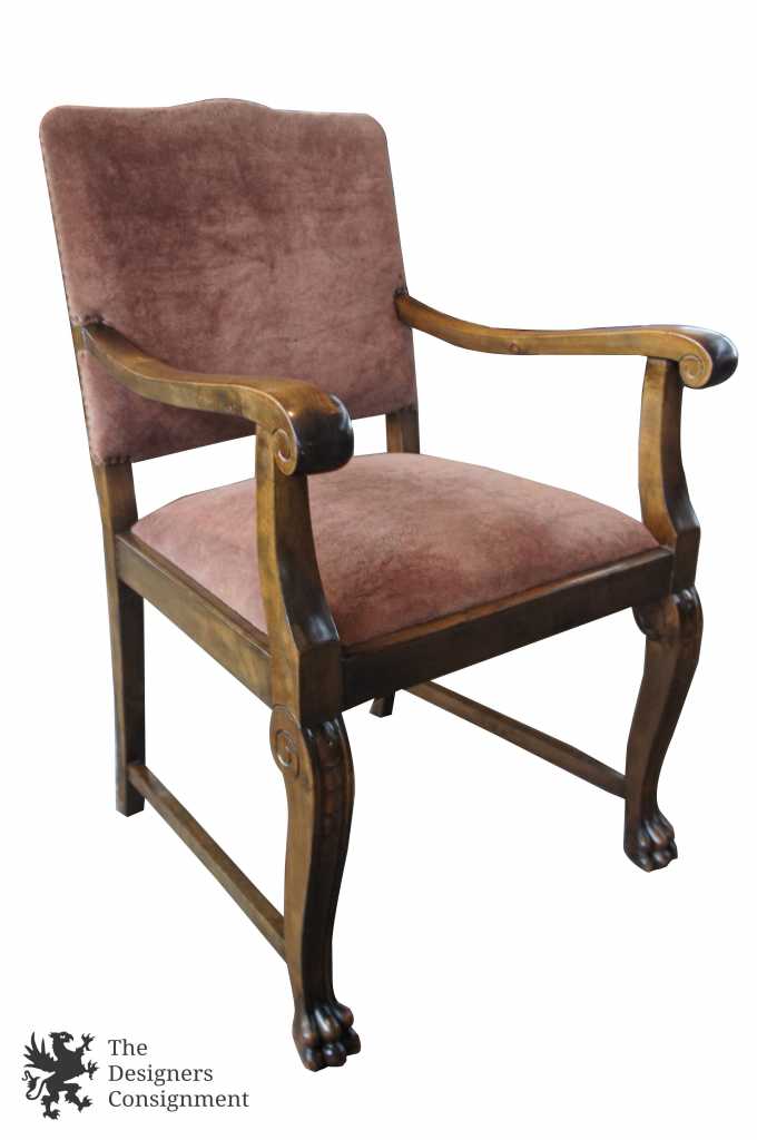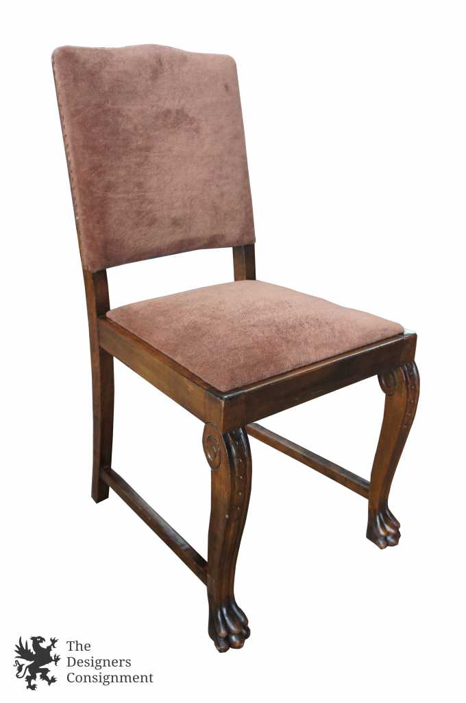 A gorgeous set of 3 early 20th century chairs. Made from walnut with scrolled accents and lion carved paw feet. Upholstered in a light maroon/burgundy with nail head trim along the seat back. A perfect set of chairs to accommodate a desk or library setting. Along the top of the back of each chair there is a finger groove for when you need to pull them out.