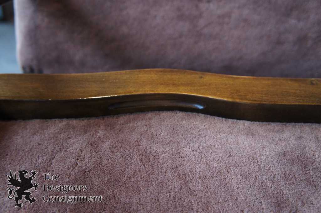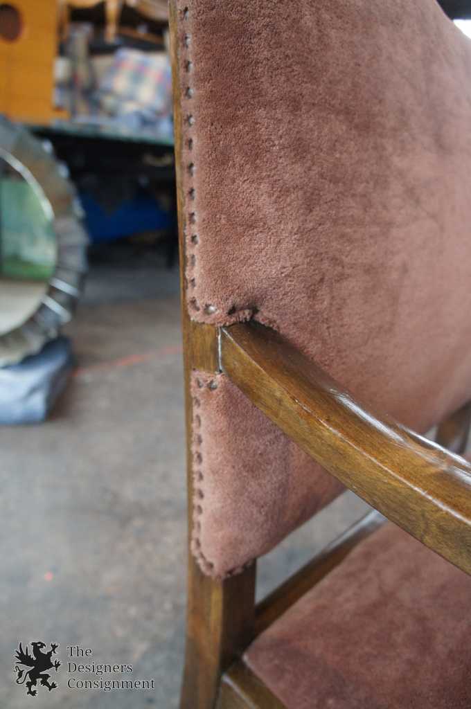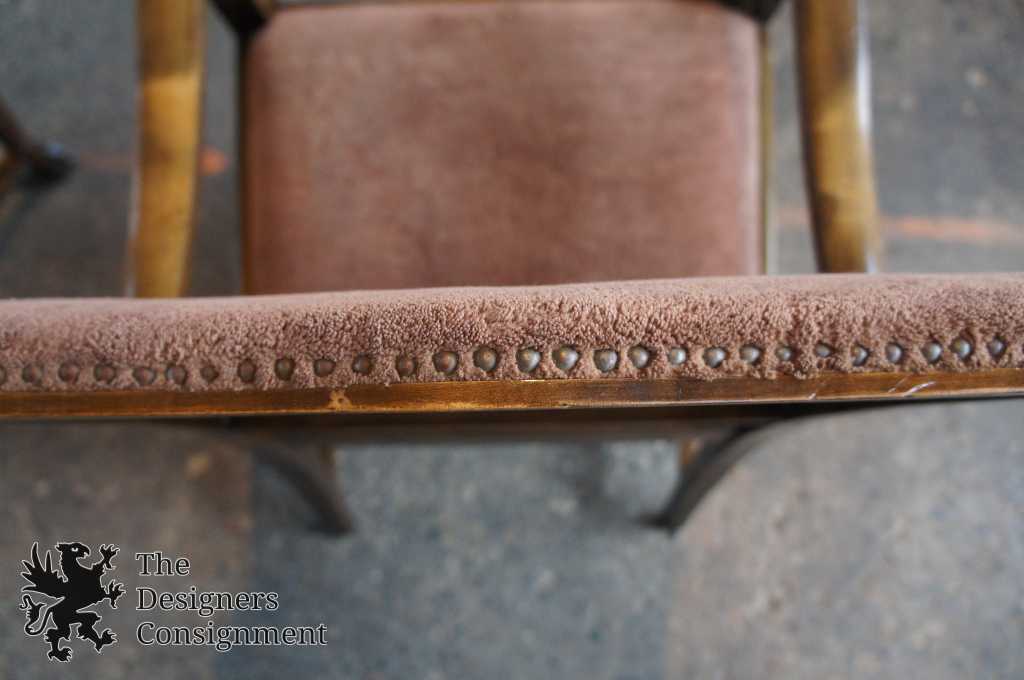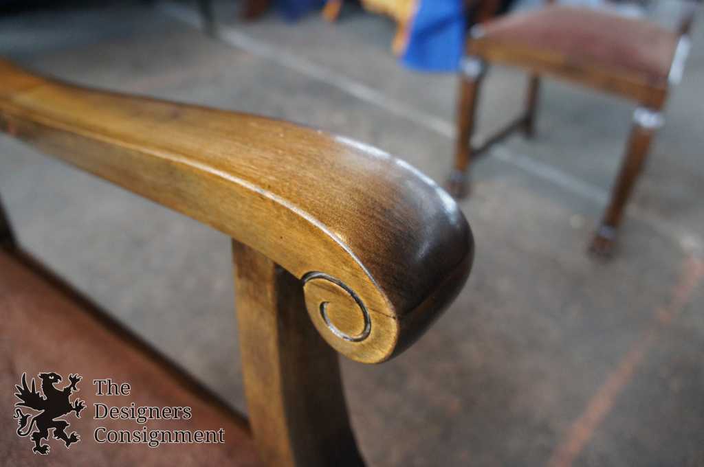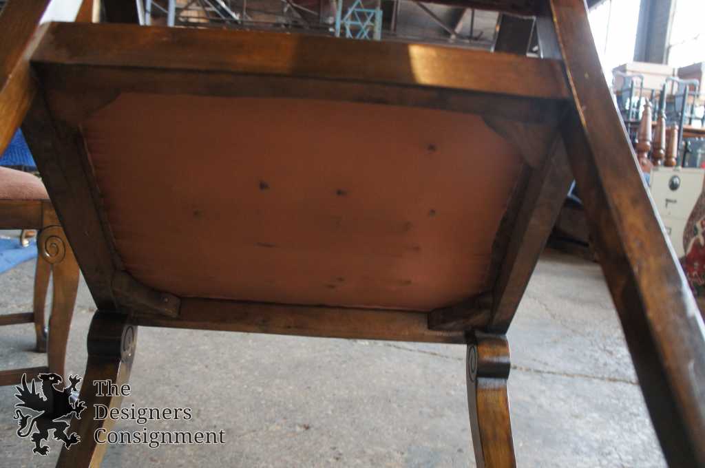 A gorgeous set of 3 early 20th century chairs. Made from walnut with scrolled accents and lion carved paw feet. Upholstered in a light maroon/burgundy with nail head trim along the seat back. A perfect set of chairs to accommodate a desk or library setting. Along the top of the back of each chair there is a finger groove for when you need to pull them out.