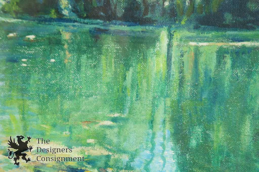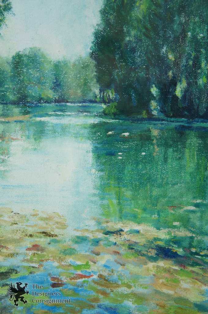 Impressionist riverscape painting. Signed with glass covered frame. Signature along the lower right is very faint.