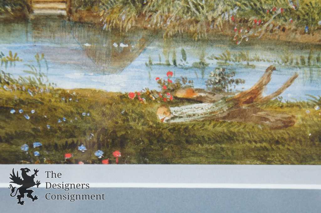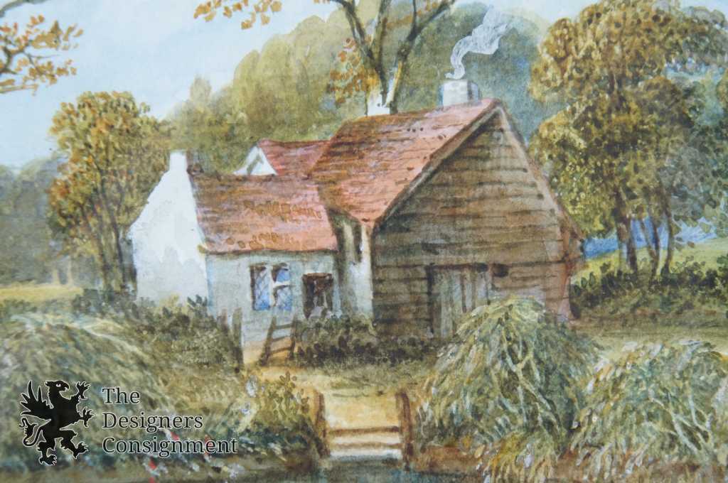 A lovely 20th century country side watercolor painting. depicts a cottage and near by pond. Framed with glass covering.