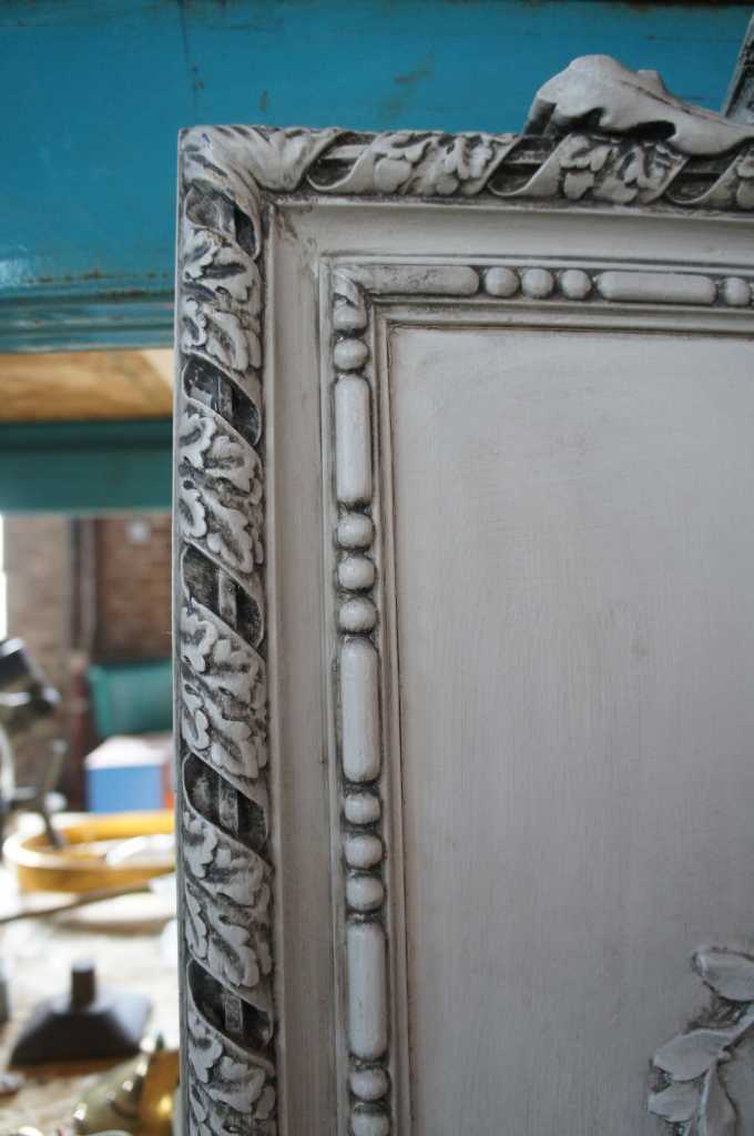 Painted Louis XVI style trumeau mirror with high and low relief carvings. Upper molding shows a laurel wreath of acanthus leaves leading down to the main panel of instruments and music sheets. Framed in classic French ribbon carving. Finished in antique white with rubbed finish. Perfect for hanging above a mantel piece.