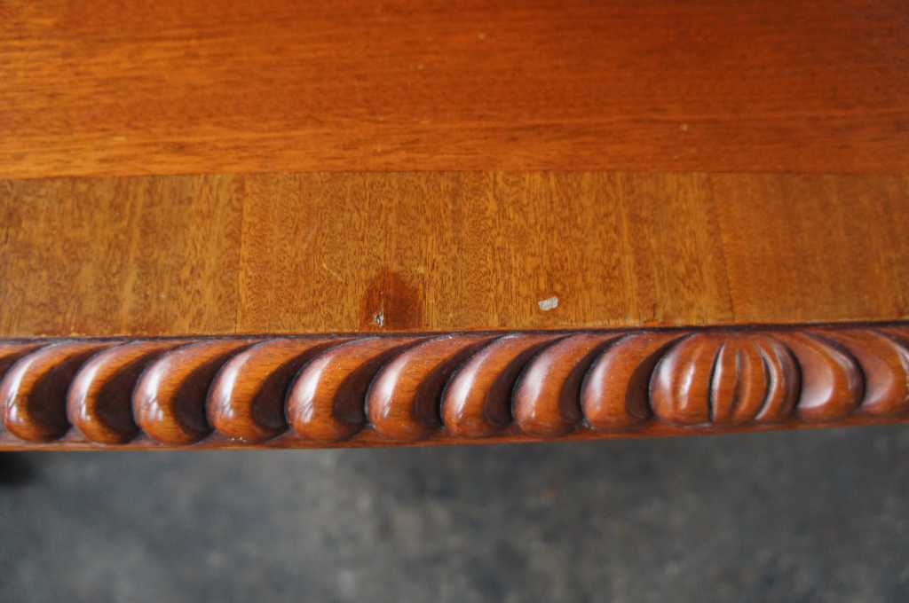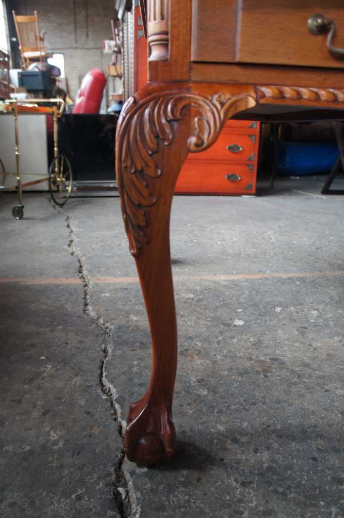 A gorgeous Chippendale style partners desk for any setting. Made from Mahogany with ball and call feet. Features 5 dovetailed drawers along each side, intricate scalloping and gadrooned aprons. For those who are unfamiliar, Gadrooning is a decorative motif consisting of convex curves in a series. It is often found along the surface edges and aprons on ornate furniture like this desk. Each corner of the piece shows a unique inset column mounted above an elongated acanthus leaf carved into each leg. The top surface shows a breakfront design adding character and depth. The perfect compliment to any room.