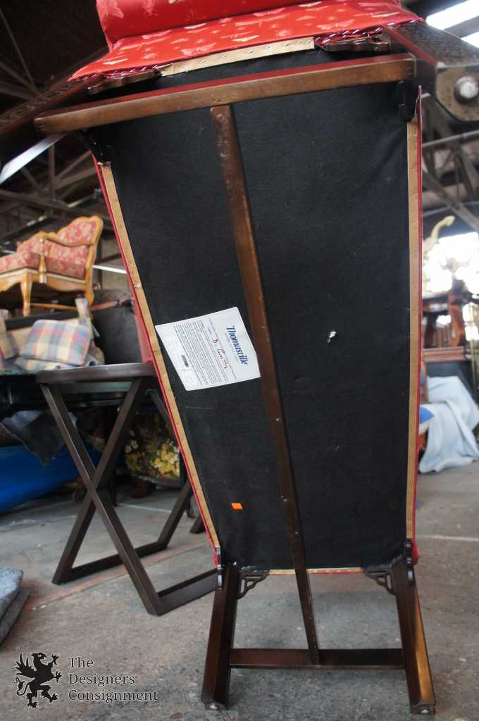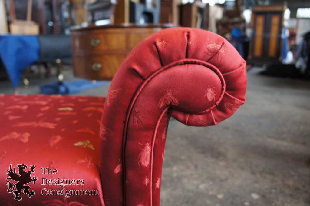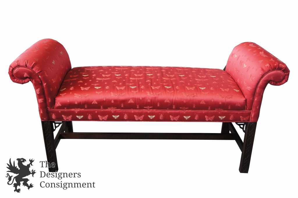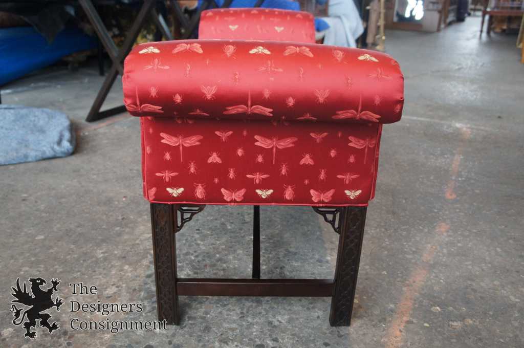 Up for consideration is a beautiful bench seat by Thomasville. Chinese Chippendale style with carved fretwork and an elegant red upholstery. Complete with rolled arms and an H stretcher trestle base. The lovely red upholstery shows an insect pattern covered in butterflies, bees and dragonflies. The piece is signed along the bottom, and was manufactured in 2005.