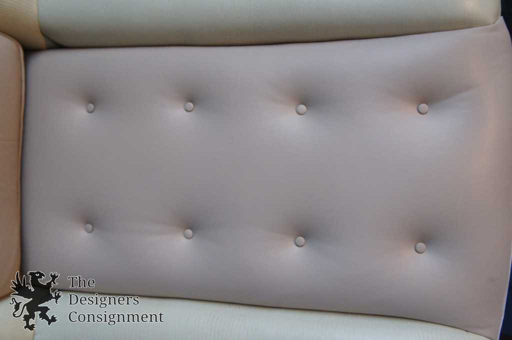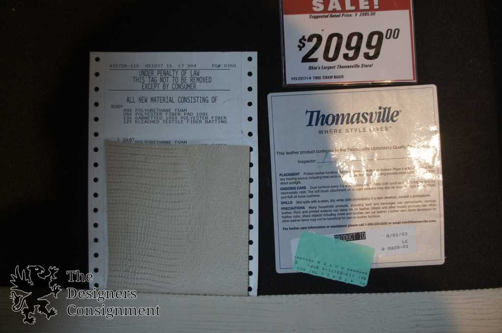 A lovely pair of chairs from Thomasville's Bogart Collection. The bogey chair features a high tufted leather back allowing it to standout in any room. A two tone leather with white along the outside and beige pink for the seat and pack. The white leather grain appears to be alligator leather making for an even more rare find. Thomasville recently filed for bankruptcy, so these chairs will be harder and harder to find. This set was purchased in 2003. Retail $2,099 Each.