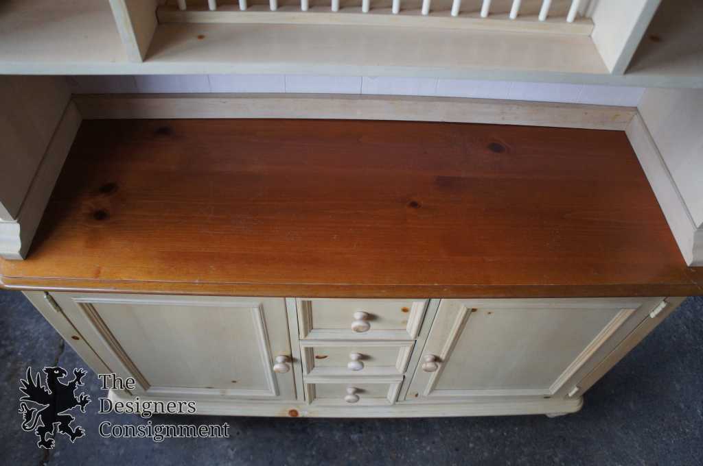 Base includes 3 drawers and outer cabinets with shelf. Hutch has plenty of cubby space and grooves for plate storage.