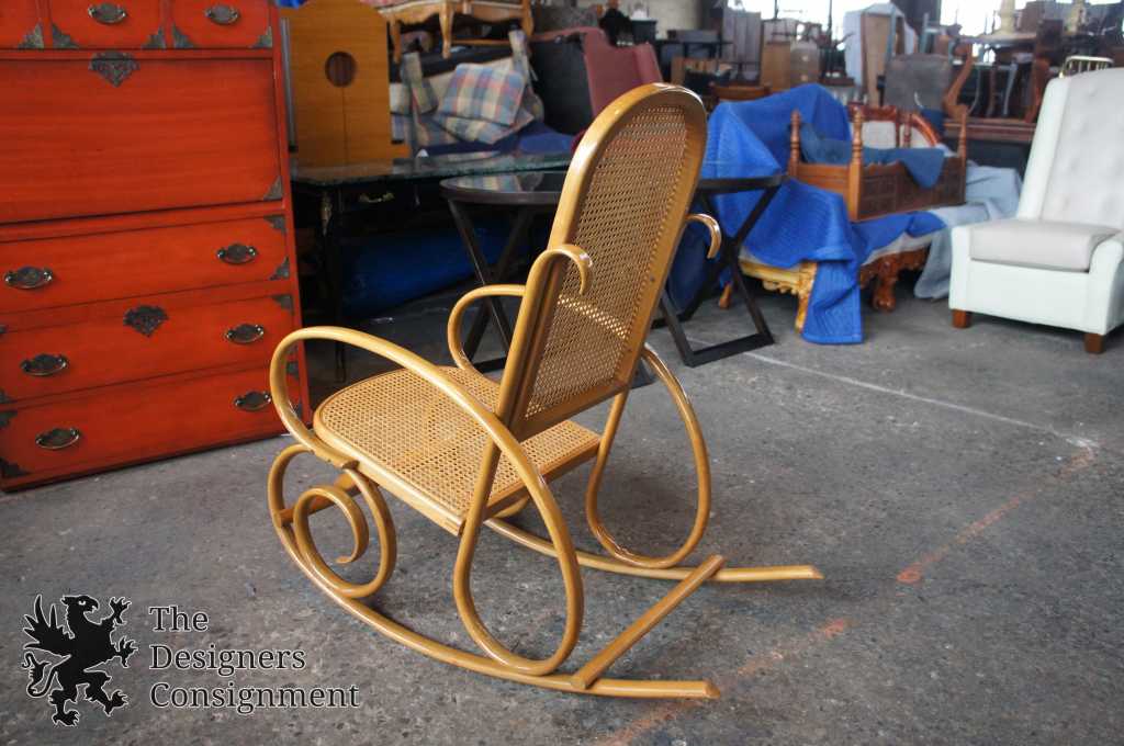 Thonet style attributed rocking chair. Circa mid century. Made from birch in the classic bentwood styling with rattan back and seat.