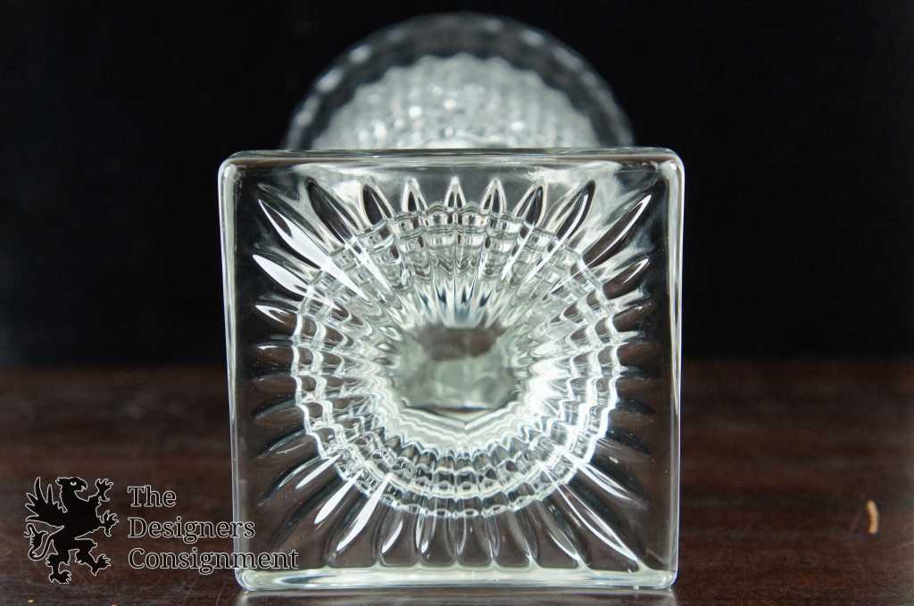 Features pressed glass, a footed base and fancy lid with finial