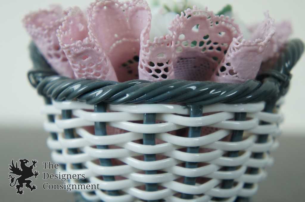 Lladro Small Grey Flower Basket 1554.3. Issued only from 1987 to 1991. Decorated with white petunias and a capricho pink lace finish.