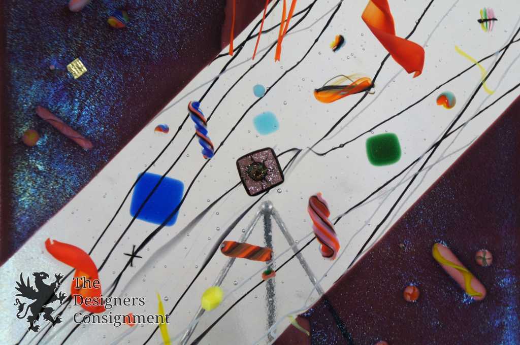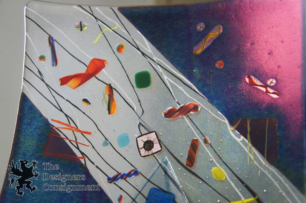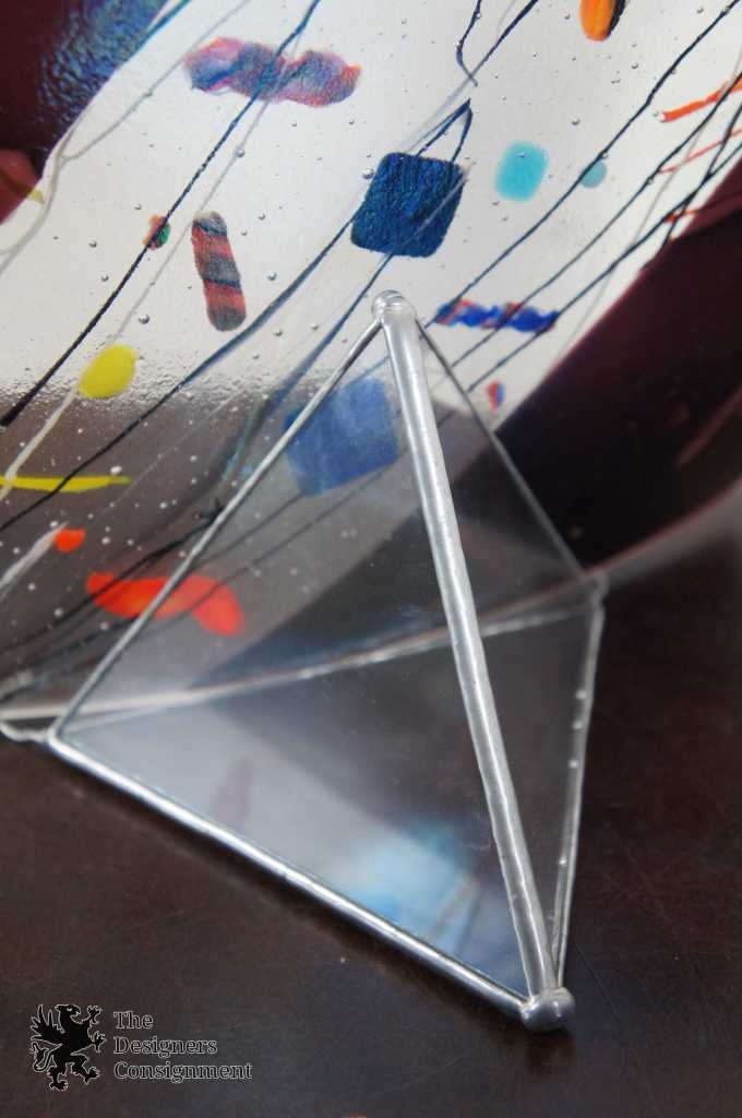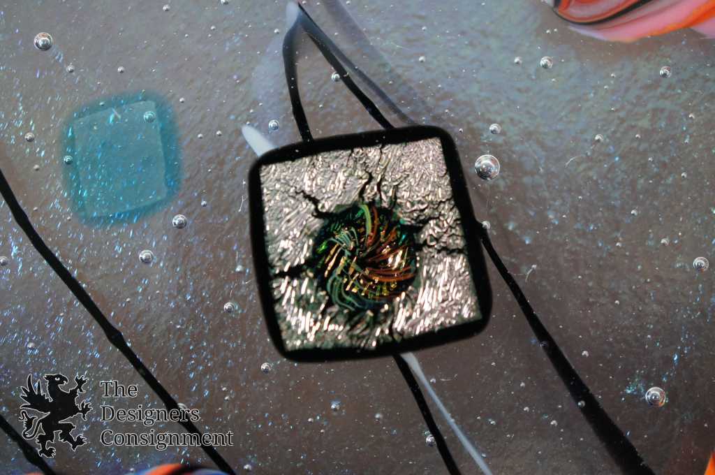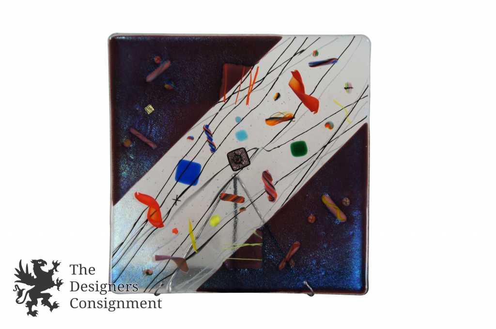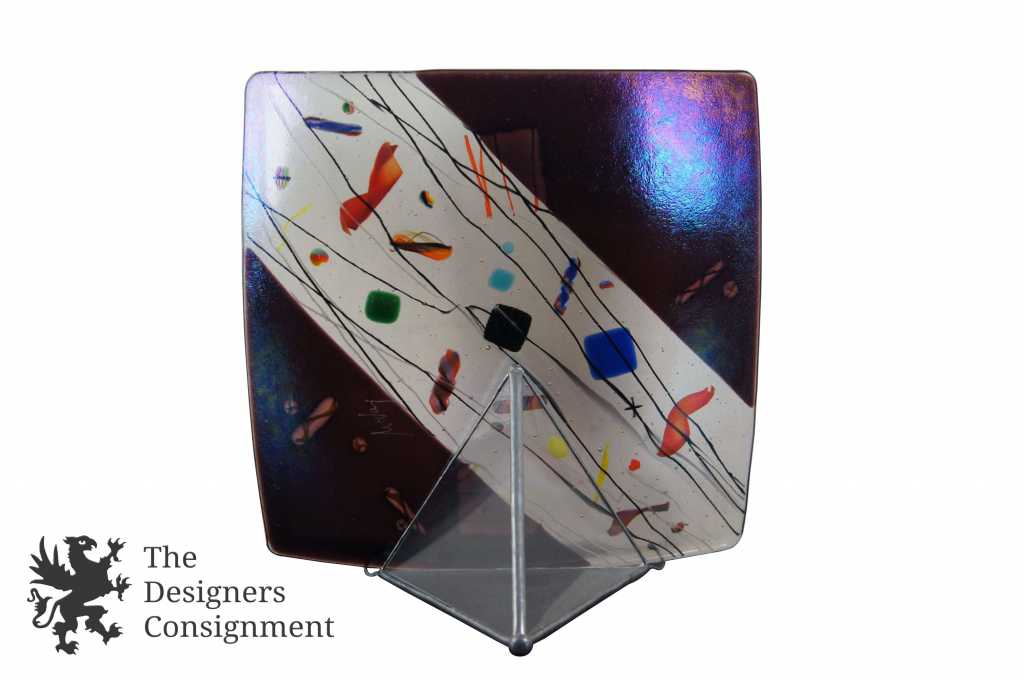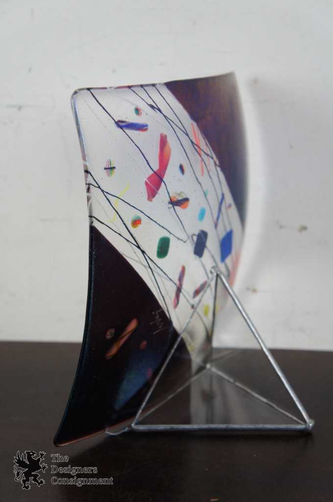 Kurt McKvay Dichroic Art Glass Plate. The plate comes with a pyramid glass stand and is hand signed along the back.