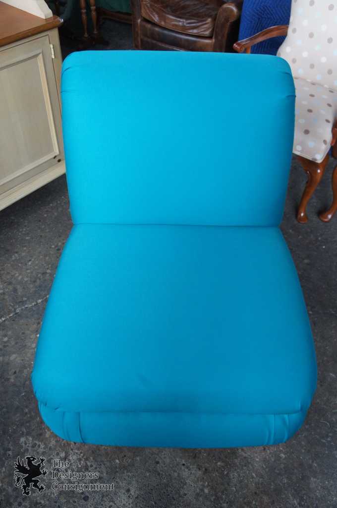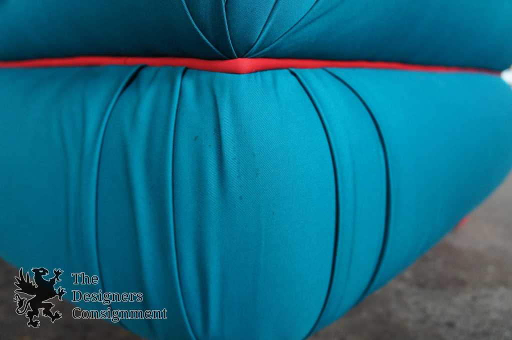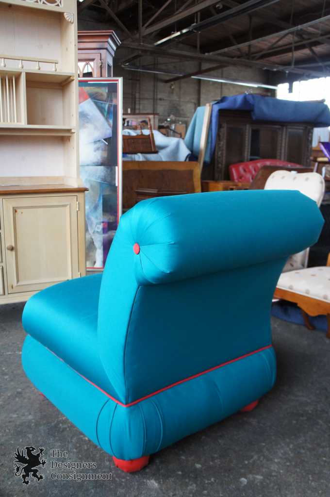Post modern, contemporary slipper chair. A large chair upholstered in turquoise with red trim. A statement for any room.