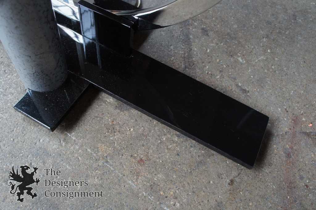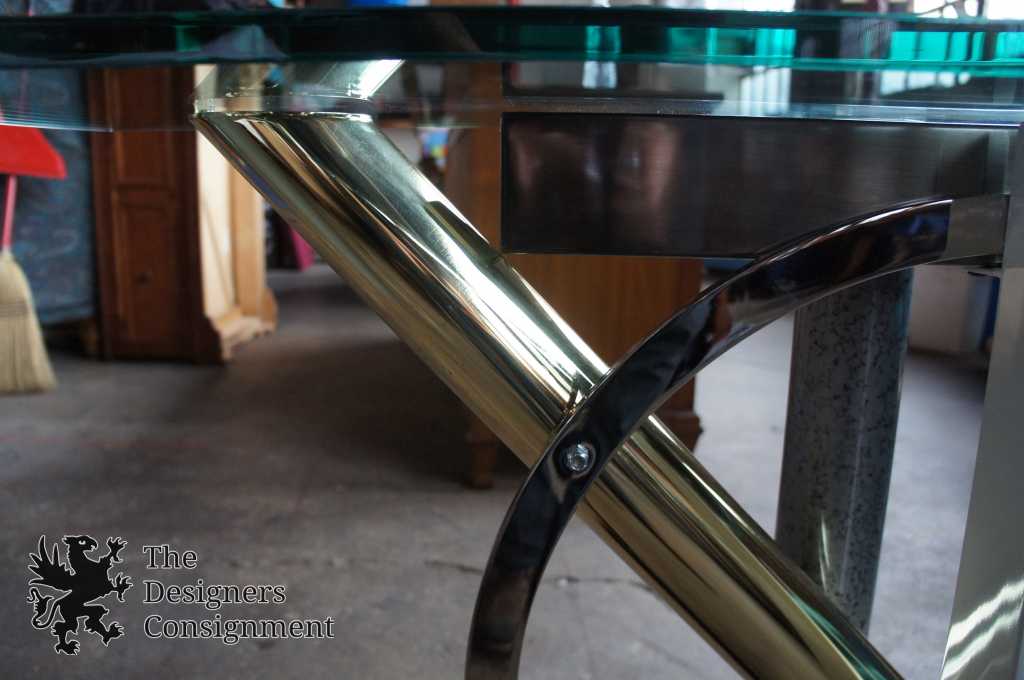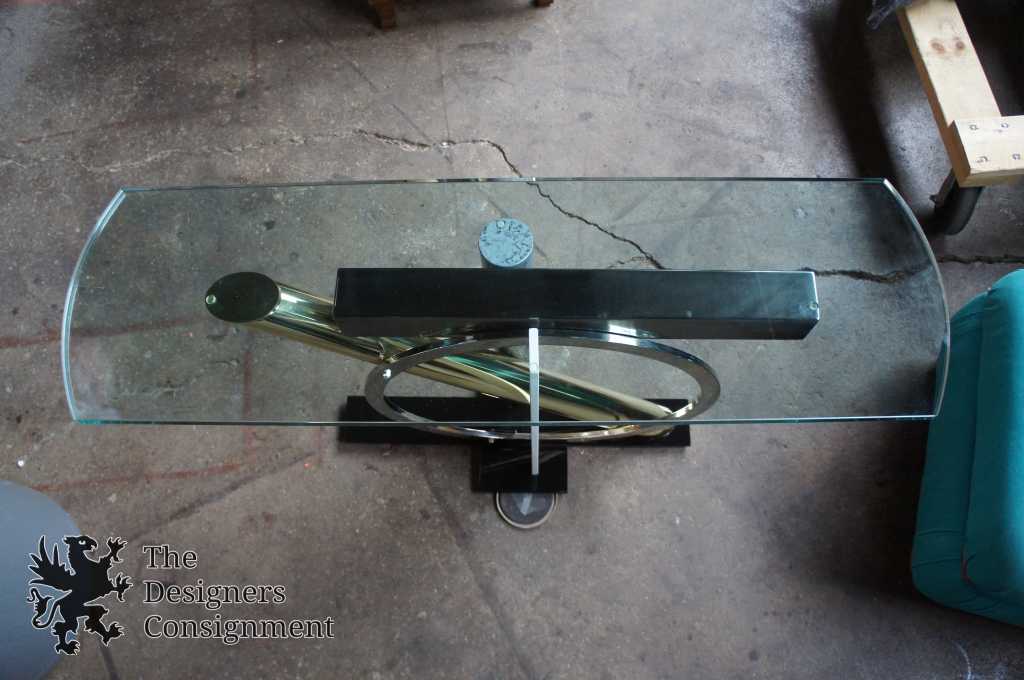 A sculptural, multi-metal console table by Kaizo Oto for the Design Institute of America. This architectural Memphis-style inspired piece uses brass, lacquered steel and stainless steel in a geometric form to create the base supporting a 3/4" thick glass top surface.