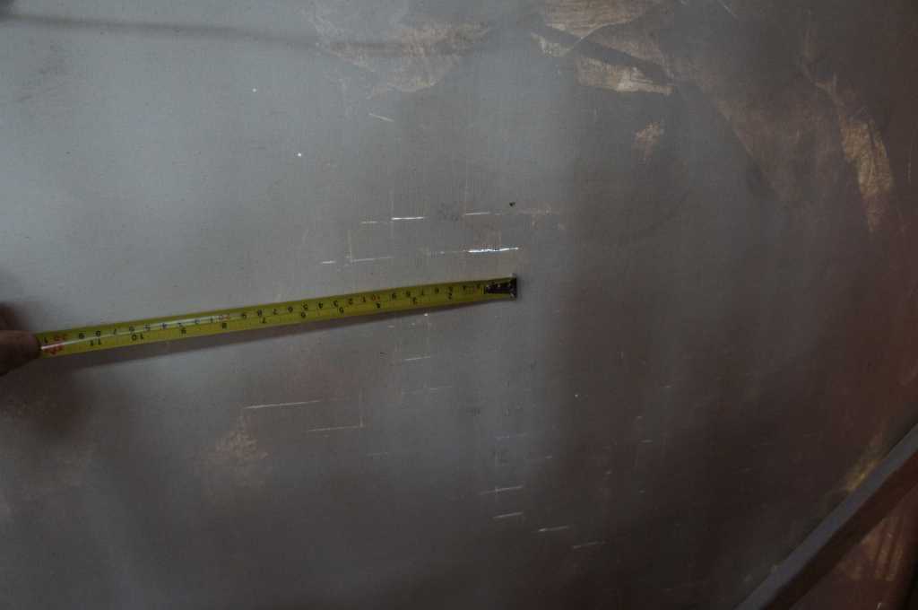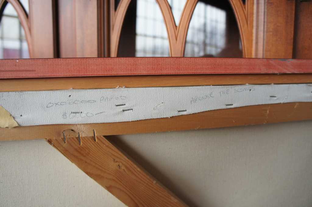 1.5" clean horizontal slice in the canvas.  Not seen along the front unless examined very closely.