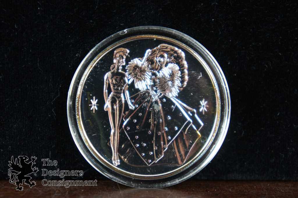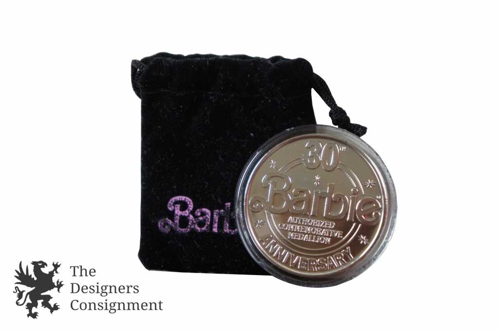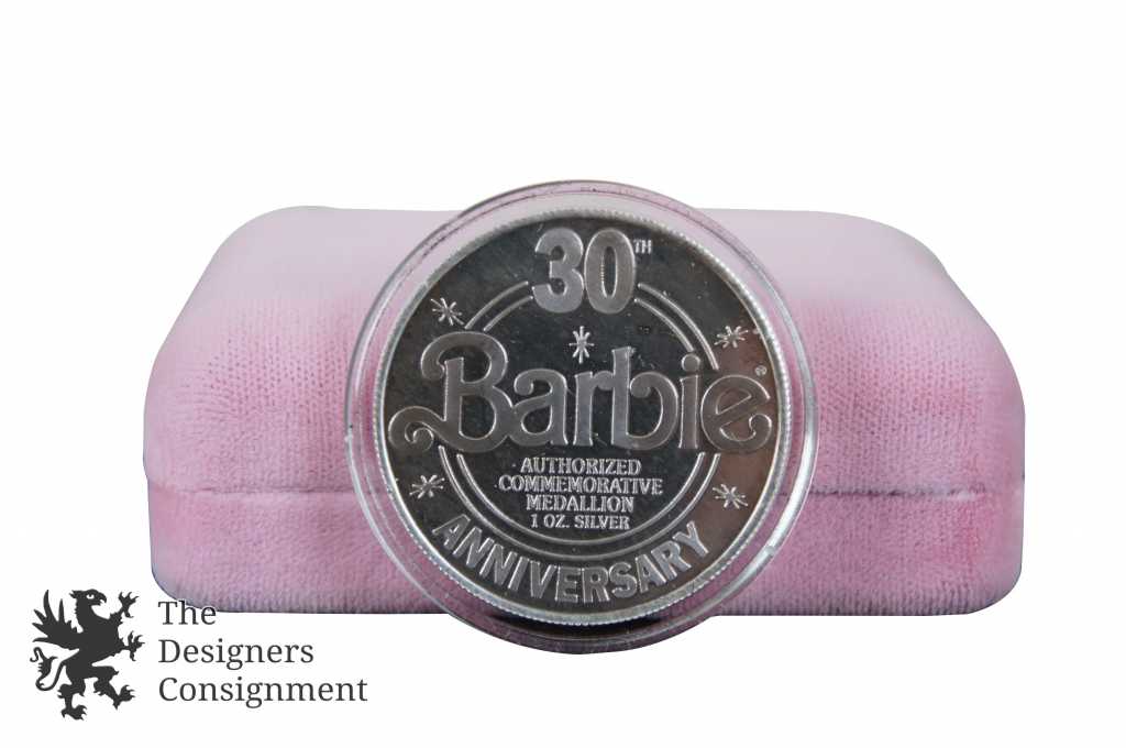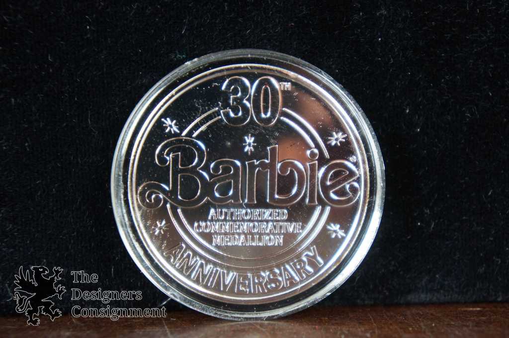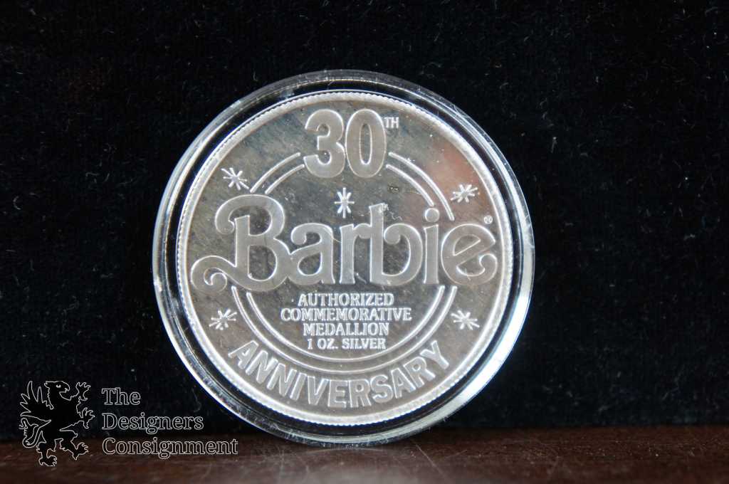 (2) 30th anniversary barbie medallion coins. One of the coins is marked 1 Oz the other is not.