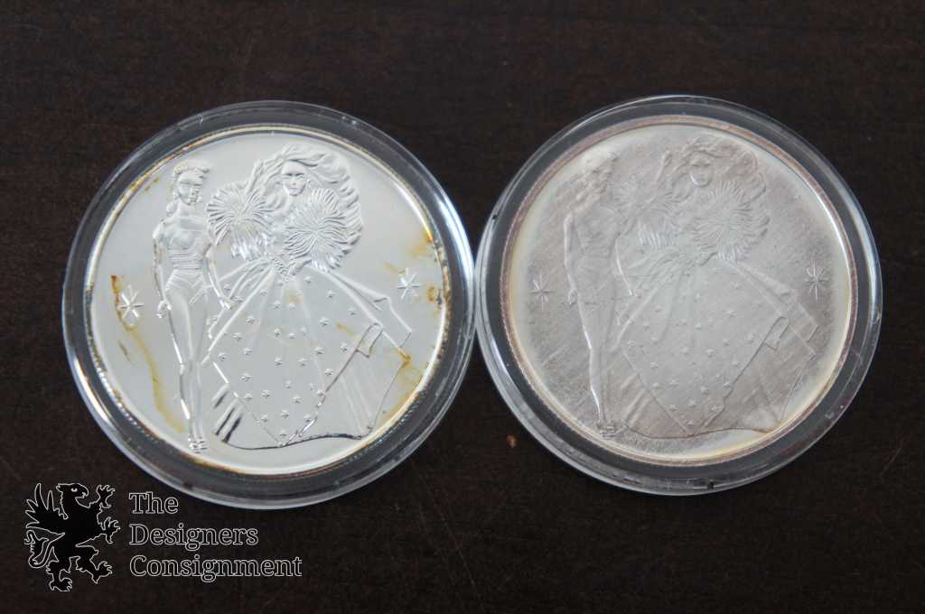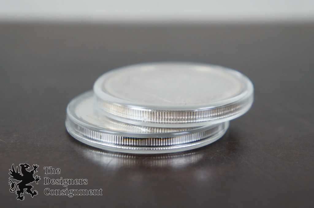 Very Good - Both in plastic cases; one marked 1 oz silver, one not (stained; fraction lighter than marked)