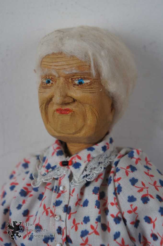 A hand carved foll from 1975 featuring an old woman with gray hair. Her lips and eyes are hand painted. She is wearing an apron over her dress. Bottom of shoe signed 1975. Maker unknown
