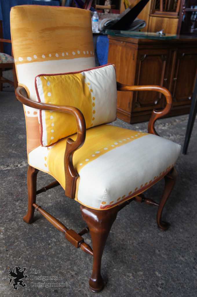 A beautiful Queen Anne chair. Made from solid mahogany with goose-neck arms and southwestern upholstery.