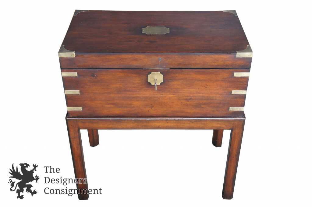 Sarreid Ltd Campaign Style Chest On Stand. Finished in Mahogany with brass banding. Includes 2 drawers with false space below and upper lockable compartment. Sarreid is based out of North Carolina and has been sourcing exceptionally crafted reproductions for over 50 years. This beautifully kept piece was purchased in the late 90s. Perfect for use as an end table or stand alone piece.