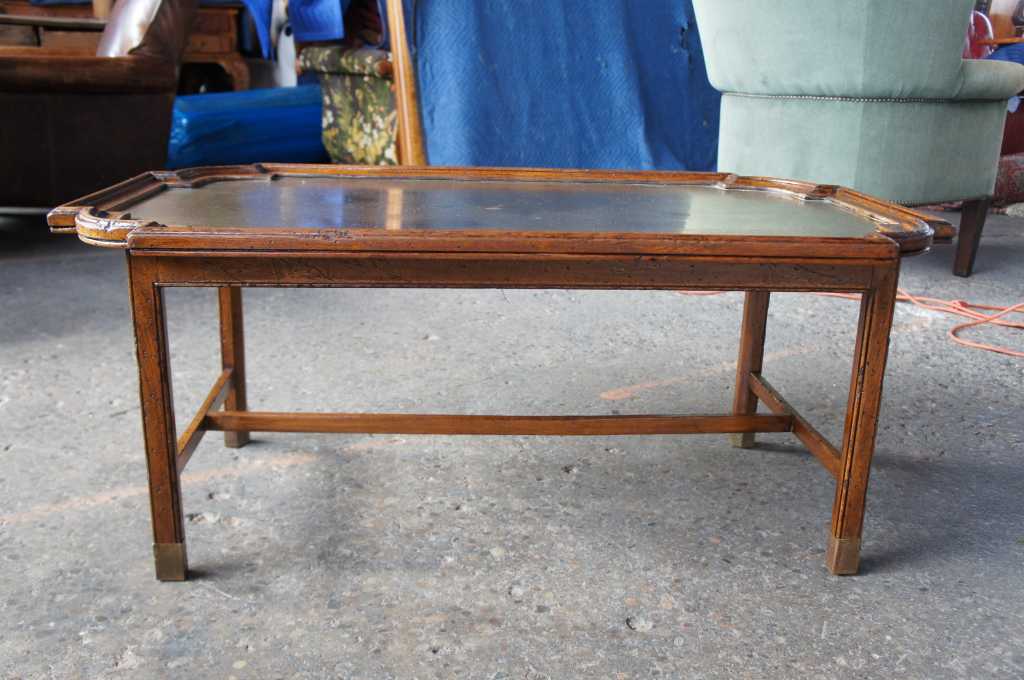 Traditional coffee table with brass top by Chapman. Made from solid wood with a trestle base. The table is rectangular with a scalloped molding. Features a heavily distressed finish. The perfect compliment to any setting.