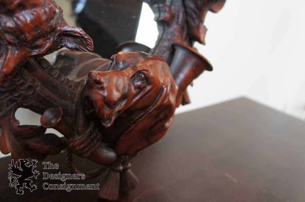 This high quality reproduction of a mid 19th century black forest mirror, features a Hound Dog, Elk, Fox and Grouse. Made of resin. Mirror can be removes and replaced with artwork. A neat addition to any collection.