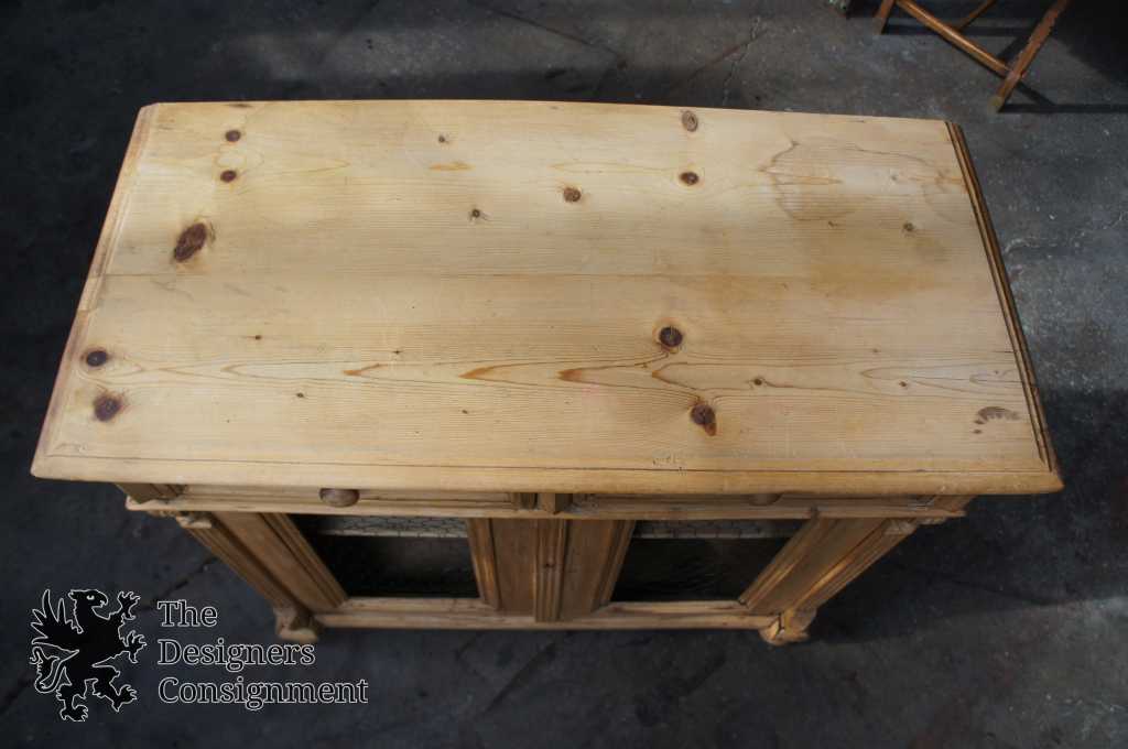 A beautiful late 19th century English cabinet. Made from pine with a bleached finish. Neoclassical style with 2 drawers over lower cabinet with shelf. Supported by four bun feet. Features chicken wire cabinet doors for an open feel. The outside of the cabinet front has elegantly grooved fluting over scrolled corbels with carved flourish. Upper drawers are hand dovetailed. The perfect compliment to any setting.