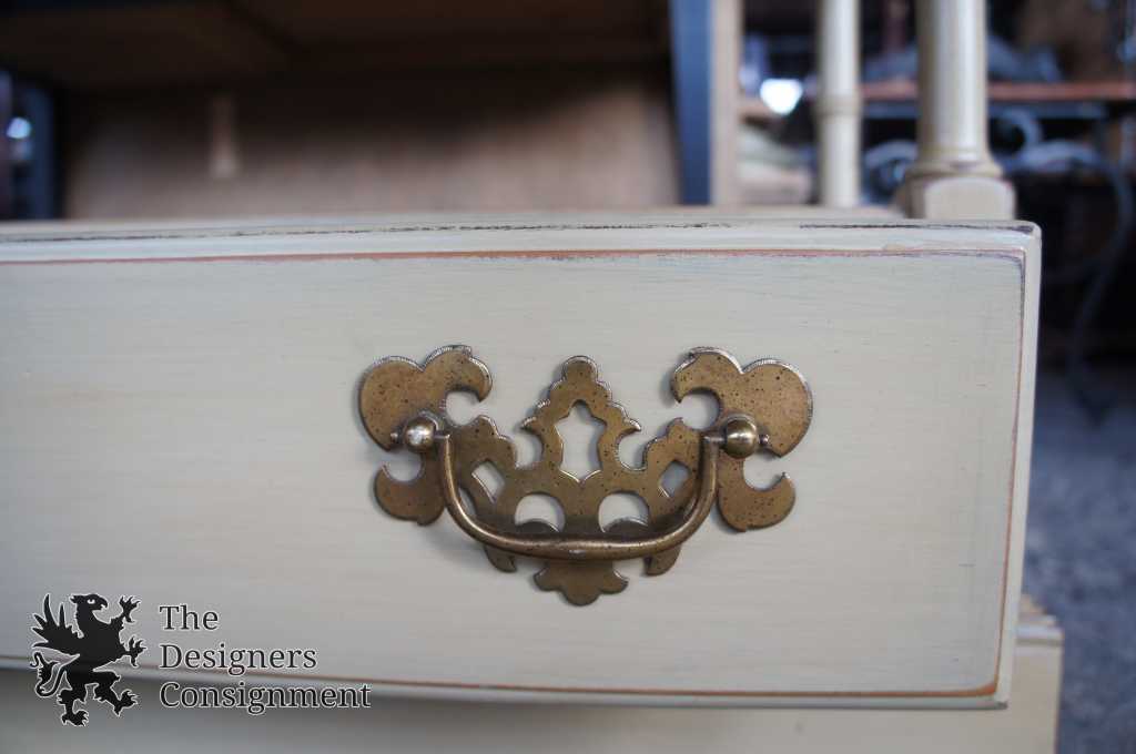 Ethan Allen Georgian Court Collection Etagere. Perfect for display of books and collectibles. Traditionally styled faux bamboo columns and lower shelf with drawer. Made from Solid Cherry with selected veneer. This cabinet has been painted in a white with slight grayish tint allowing for the original cherry to still be seen in places. A neat compliment to any setting.