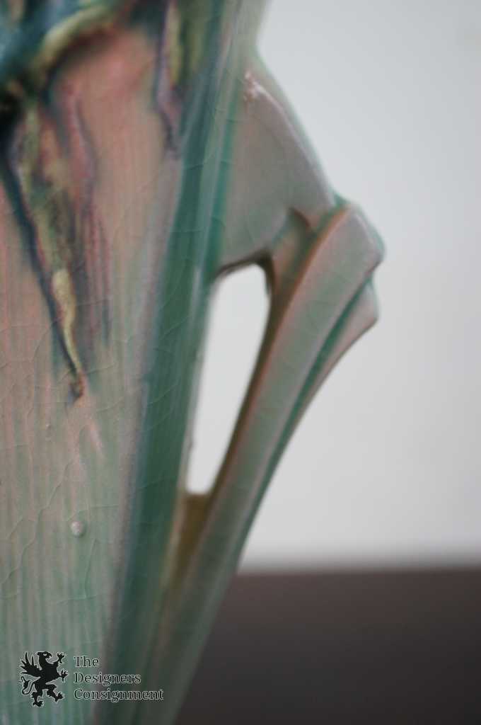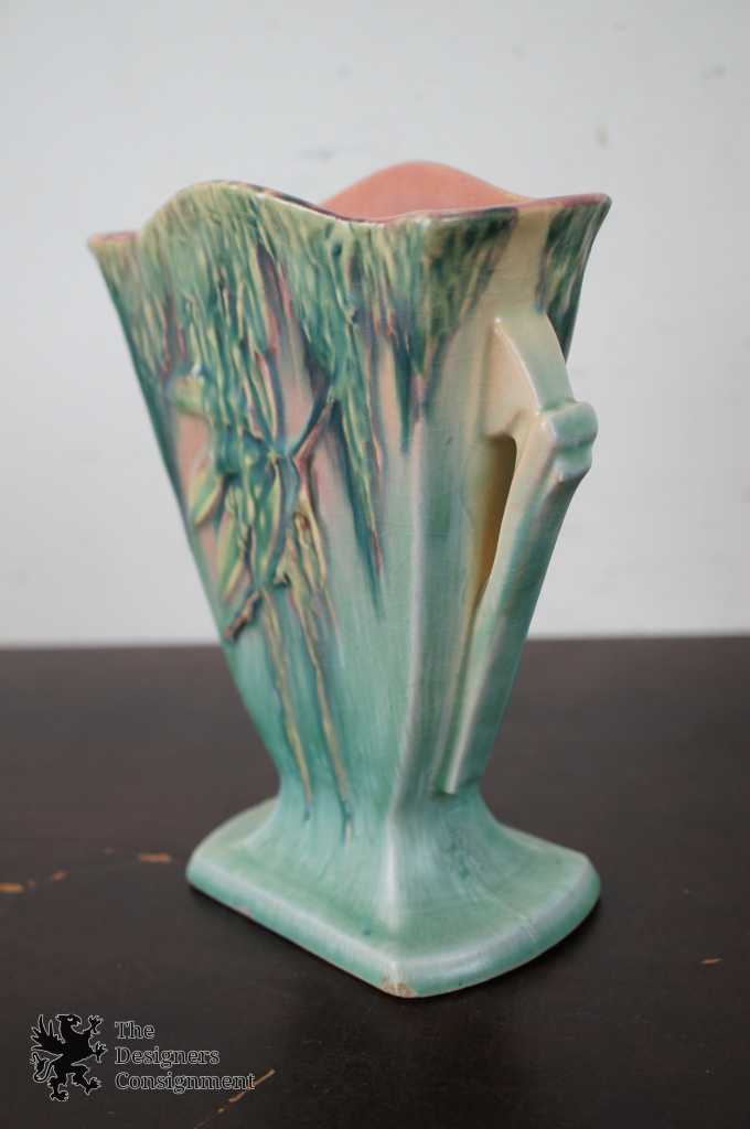 Moss is a middle period line introduced by Roseville Pottery in 1936. Standard colors include pink, blue, and tan/peach. The shapes are mid-century modern art deco style. The pattern has 38 different shapes, including vases, jardinieres, pedestals, flower frogs, flower pots, candlesticks, and wall pockets. Moss is marked with the die-impressed Roseville script mark, shape number, and size.