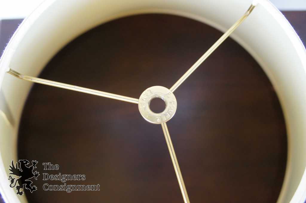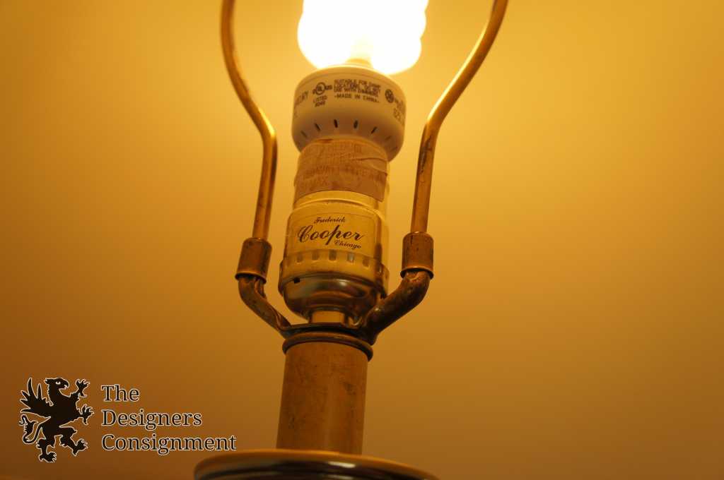Frederick Cooper Trophy Lamp. A smooth wooden urn shaped center with alternating brass and black accents over a footed base. Comes with original shade. A neat addition to any setting.