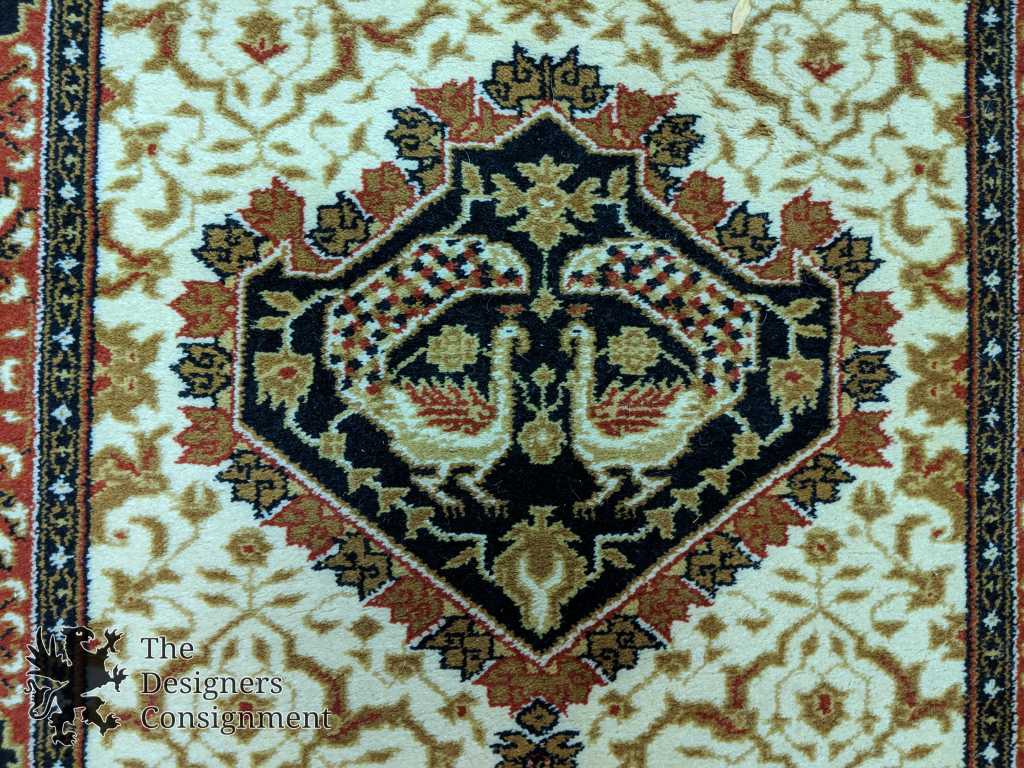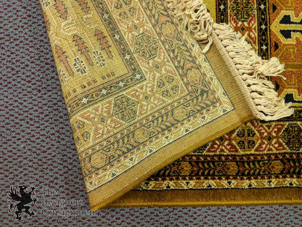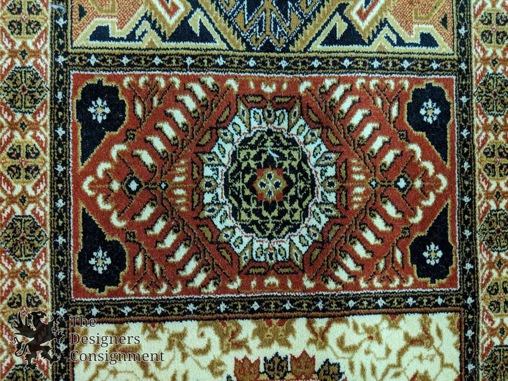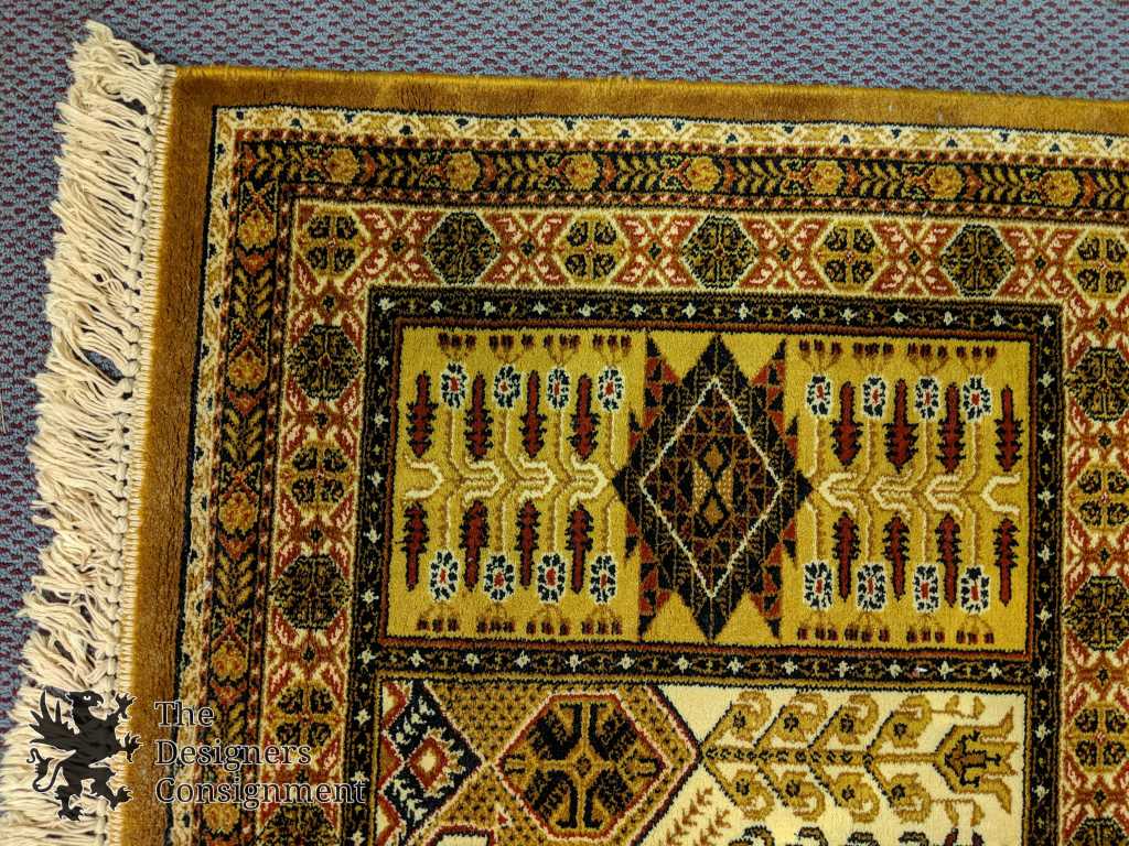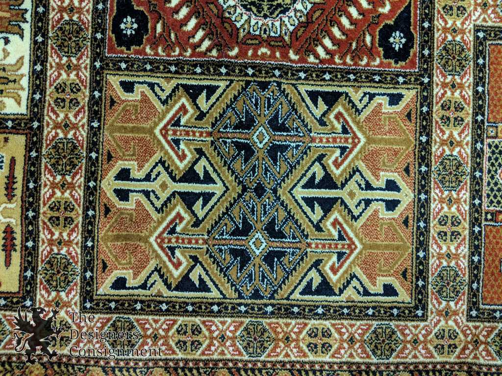 Traditional Bakhtiari inspired area rug. Machine made from wool. The Bakhtiari rug, along with other weavings, is a major artform of the Bakhtiari tribe, located in Chahar Mahaal and Bakhtiari, Iran. They have been weaving rugs exported around the globe since the early 19th century.