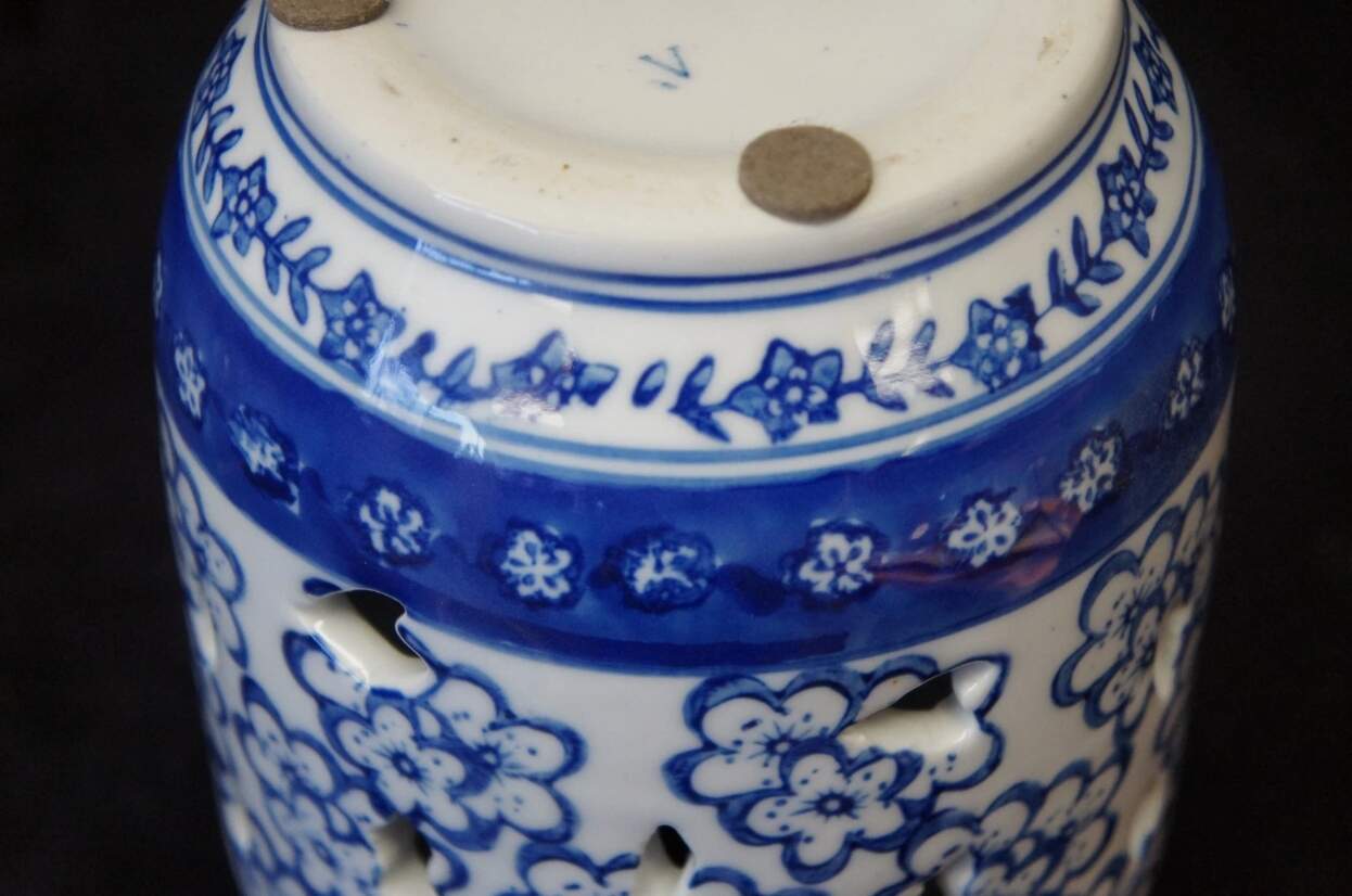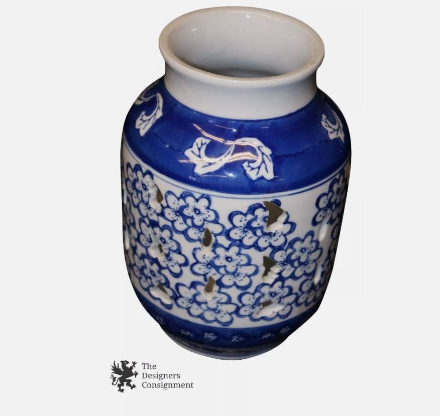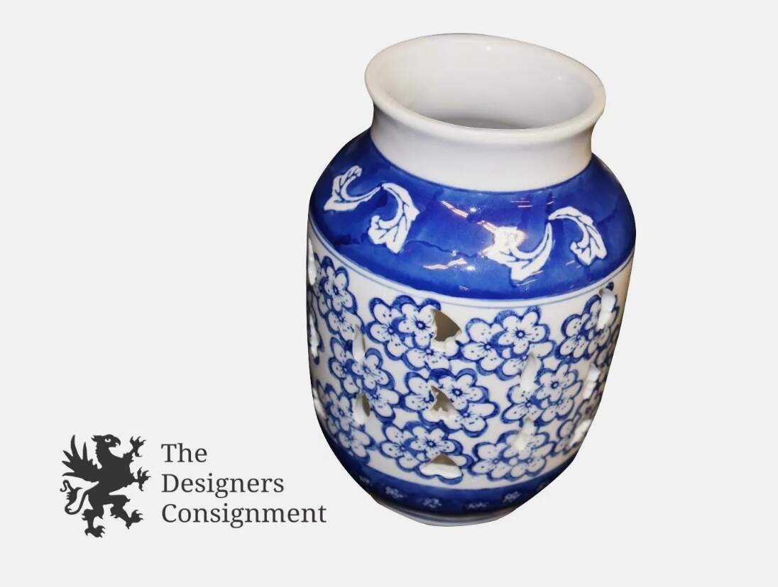 This is a gorgeous piece of fine porcelain. It is a reticulated porcelain vase and it is decorated with floral designs and it has a lovely blue and white color. This is an absolutely beautiful piece and it would make a wonderful addition to your home or collection.