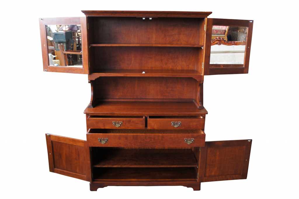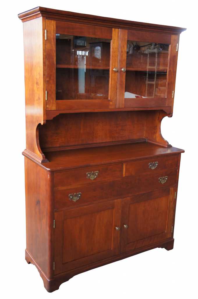 Exceptional Amish made cherry cupboard. Early American in style with a glass front and brass hardware. The base has 3 dovetailed drawers along the top and lower cabinet with shelf for storage. Hutch features a plate groove along the very back of the main surface in addition to a glass front display with shelf. A neat addition to any setting.