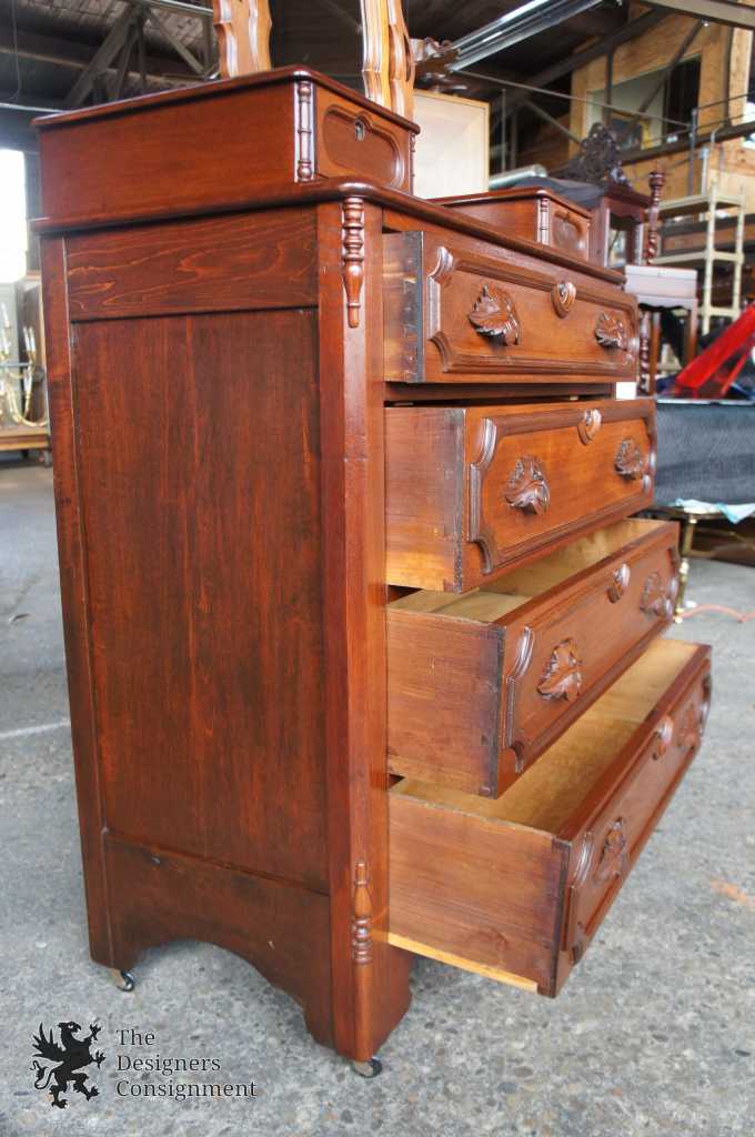 A Victorian dresser in american walnut, having a swiveling wishbone mirror, between raised glove drawers and a rectangular top with molded edge. Below are four drawers, each having hand dovetailed construction with carved fruit and nut handles, above a serpentine apron on casters. Upper and lower corners of the frame are lined with turned finials. Circa 1870s. An exquisite addition to any bedroom setting