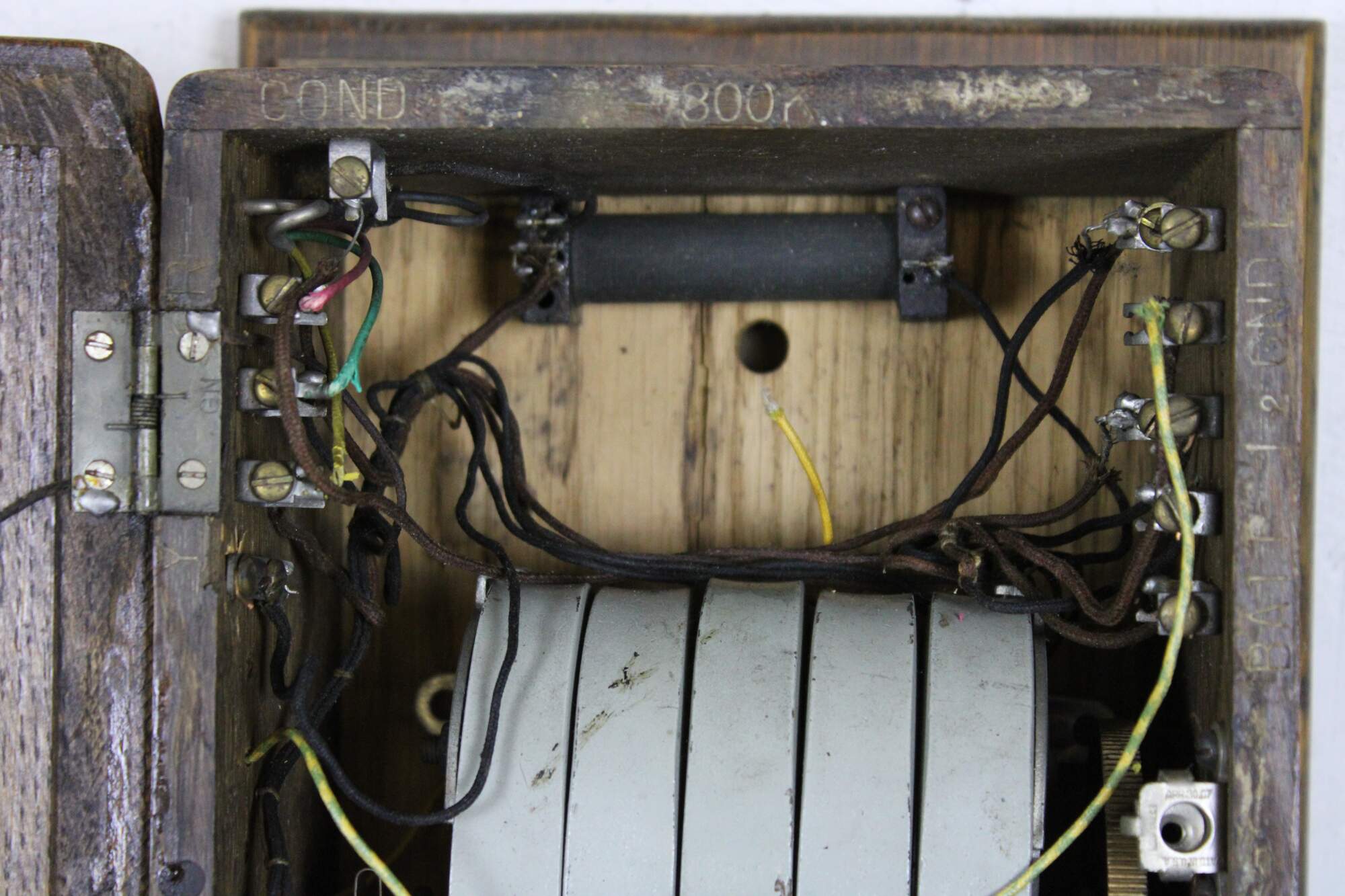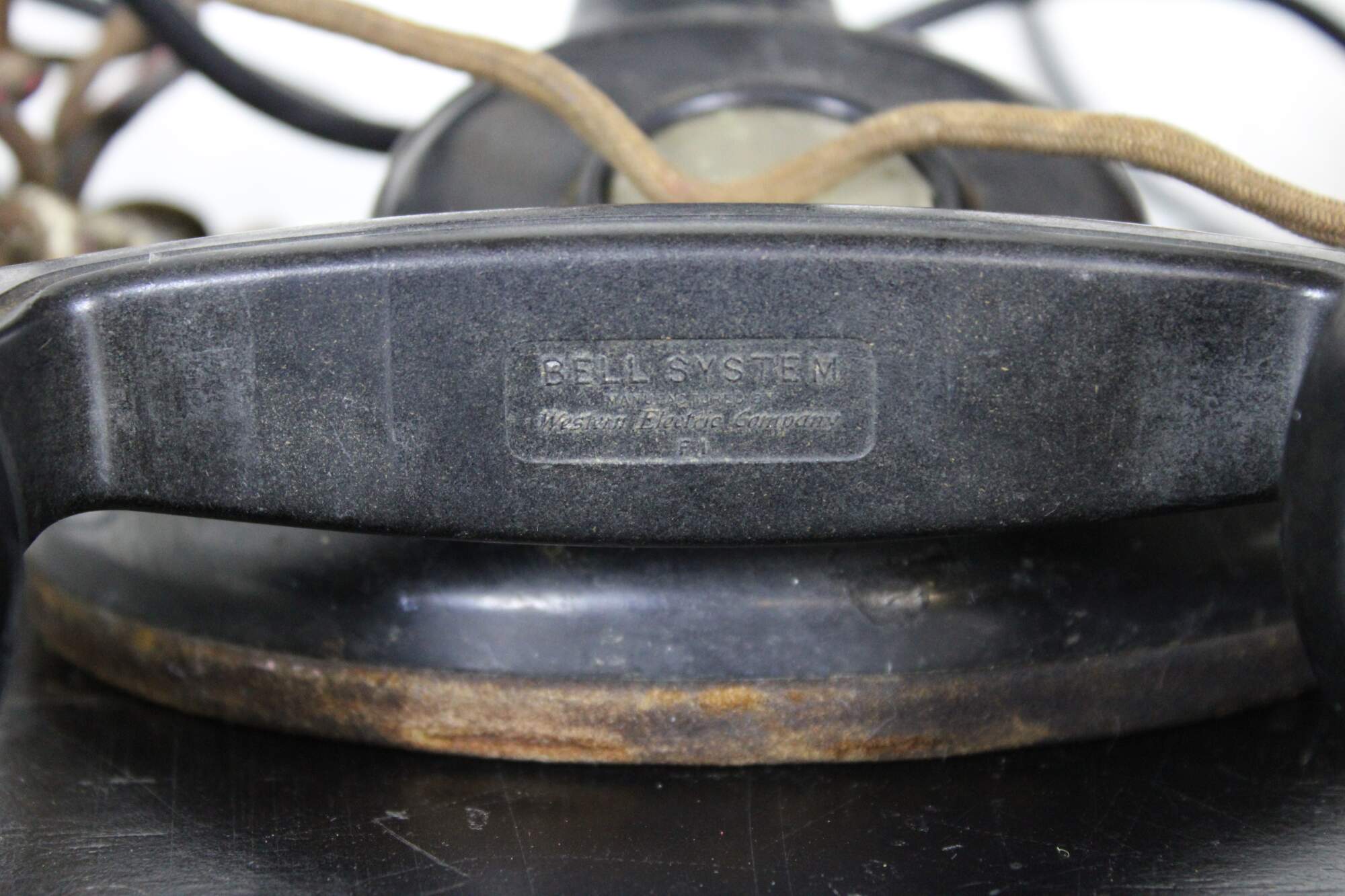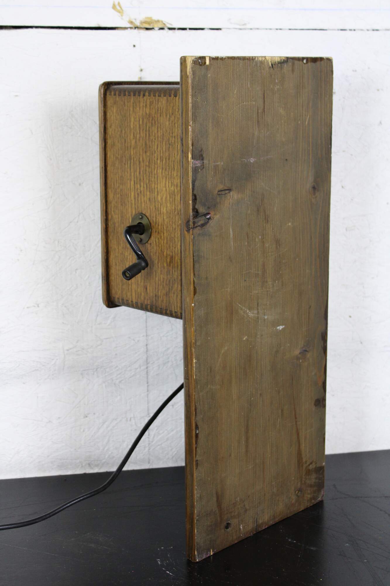 Antique early 1900s Western Electric / Bell Systems oak wall mounted hand crank telephone ringer box with black bakelite tabletop handset.