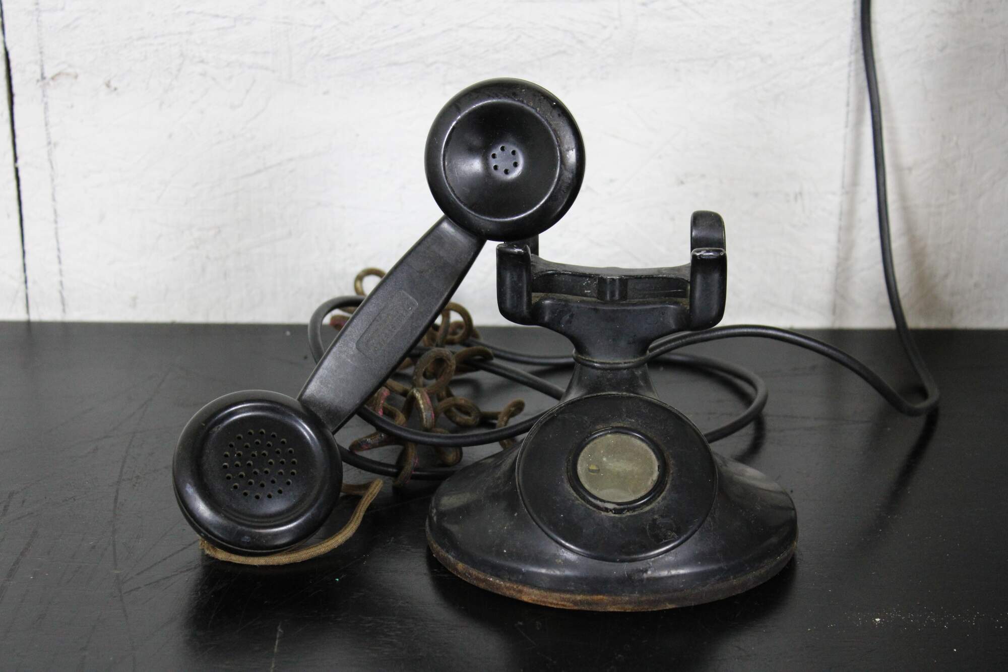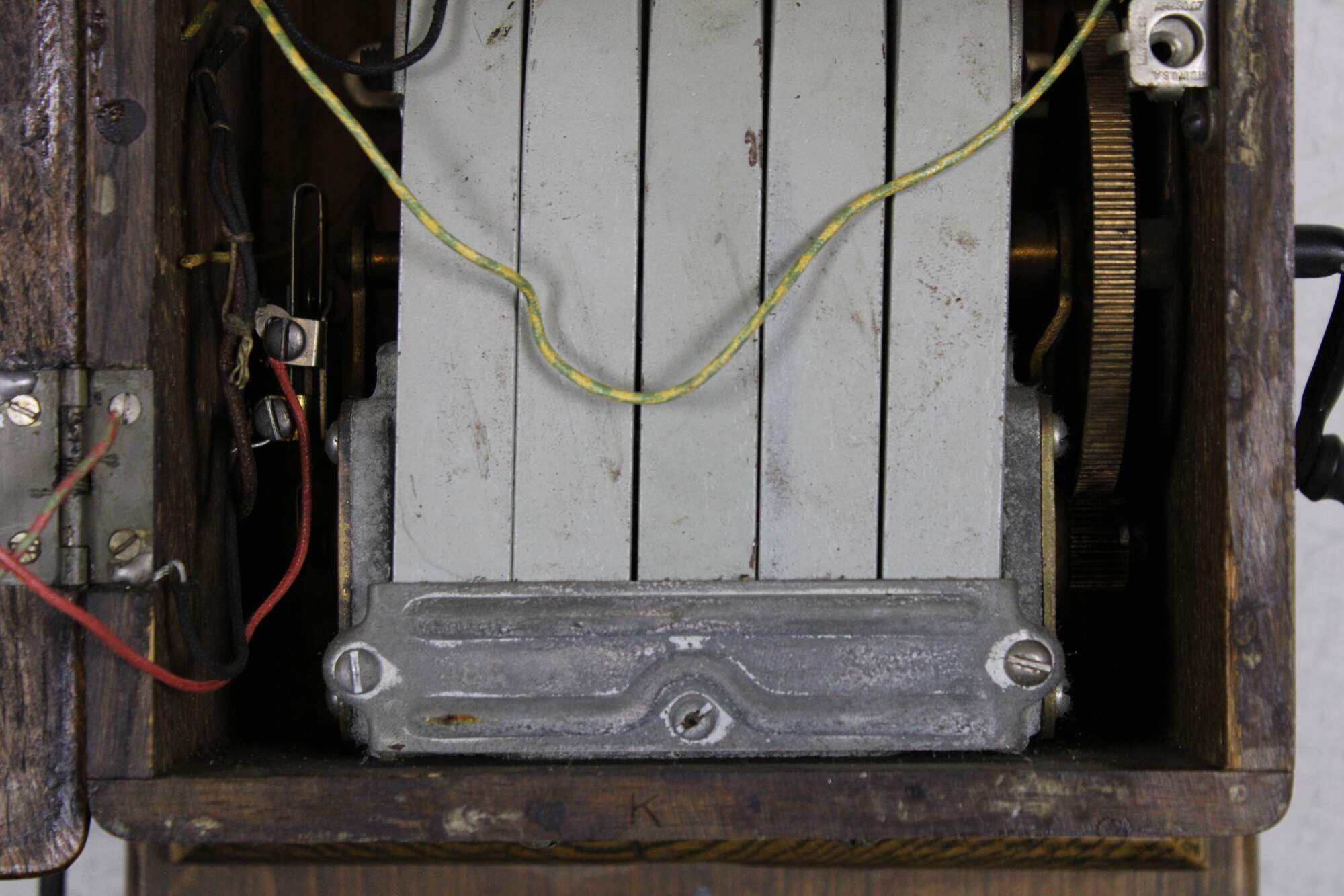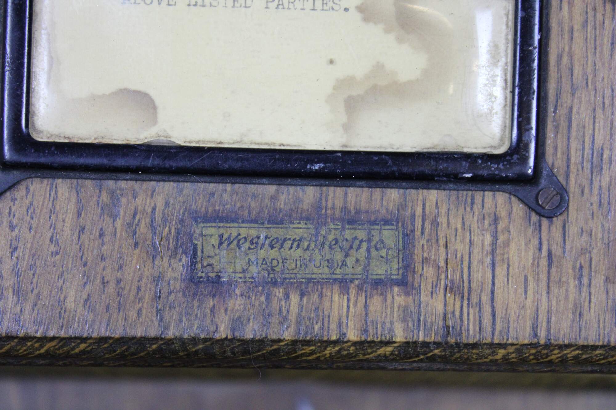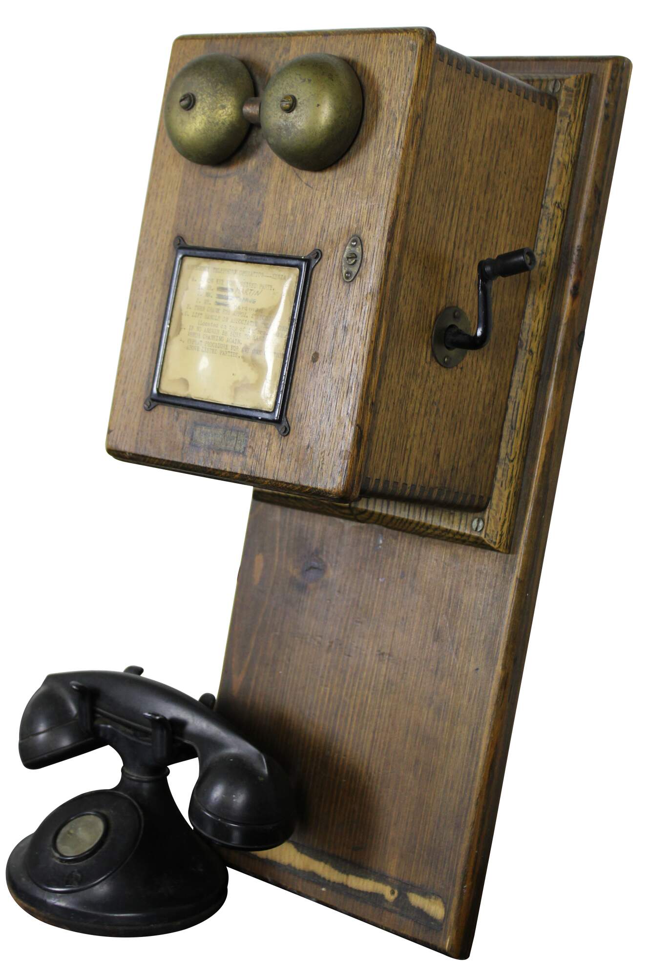 Antique early 1900s Western Electric / Bell Systems oak wall mounted hand crank telephone ringer box with black bakelite tabletop handset.