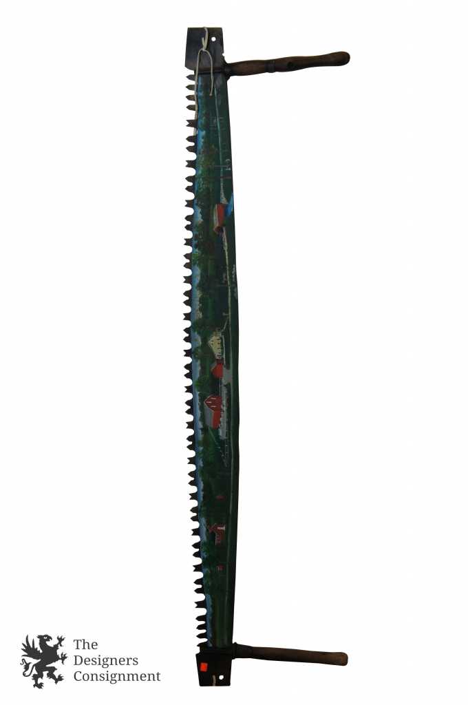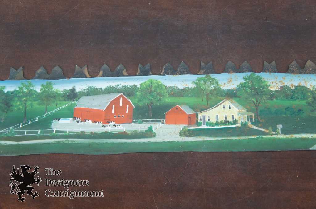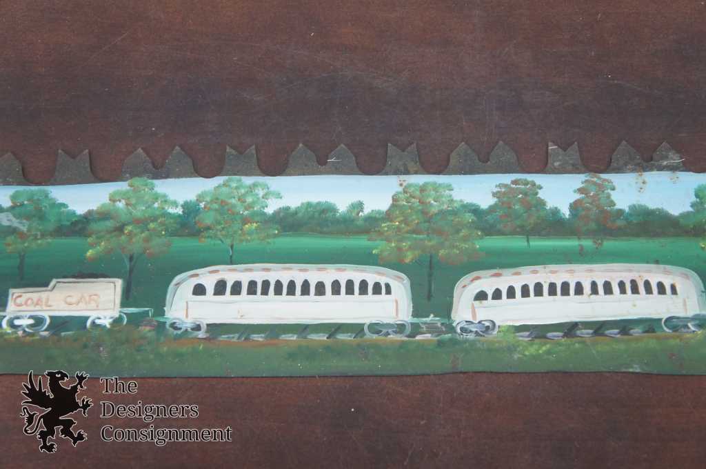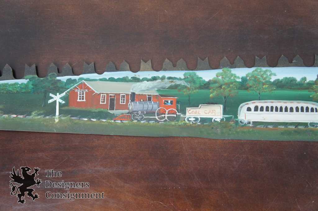A beautifully hand-painted two man crosscut saw. Features a train scene along one side and a farm scene on the other. Hand signed by Ross 1976. The perfect conversation piece for any home