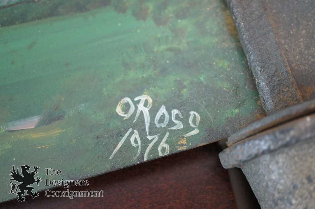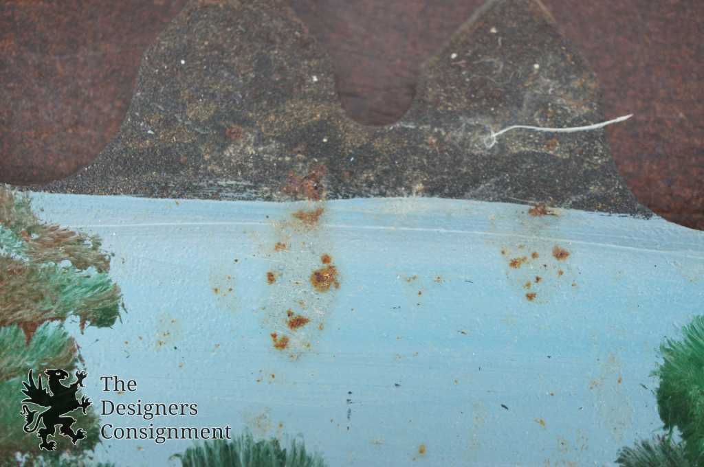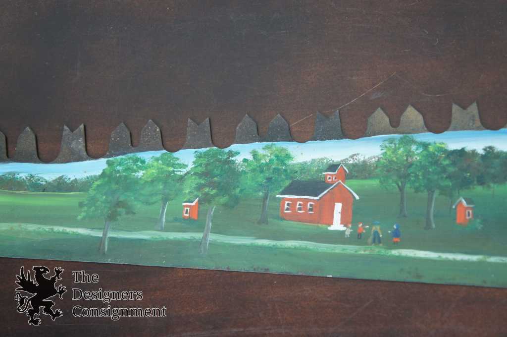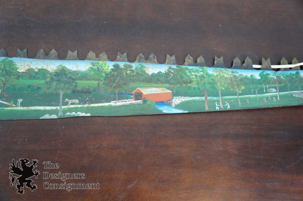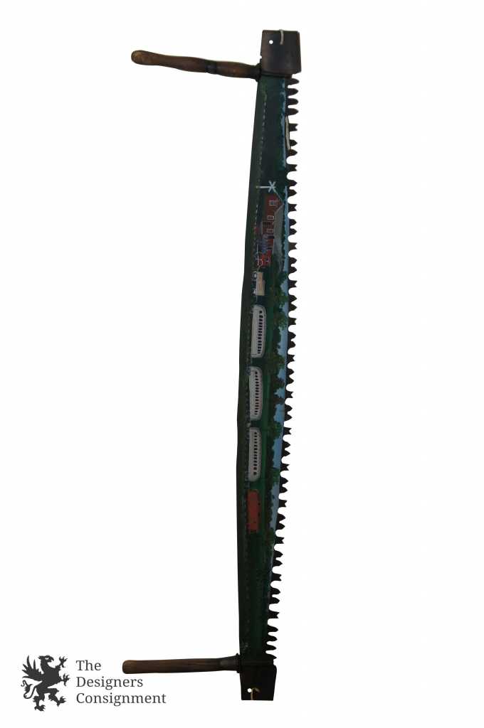 A beautifully hand-painted two man crosscut saw. Features a train scene along one side and a farm scene on the other. Hand signed by Ross 1976. The perfect conversation piece for any home