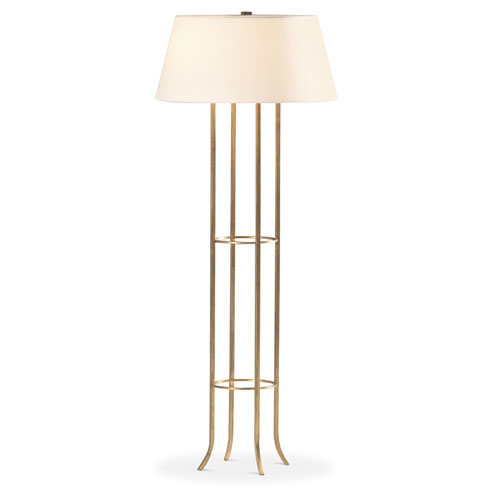 This slim, elegant Metal Cage Floor Lamp gains its steadfast poise from a base of Old World forged iron, which is then finished with a hand-rubbed gold leaf for warmth and style. Standing on slightly tapered feet, this refined lamp is completed with an ivory shade.