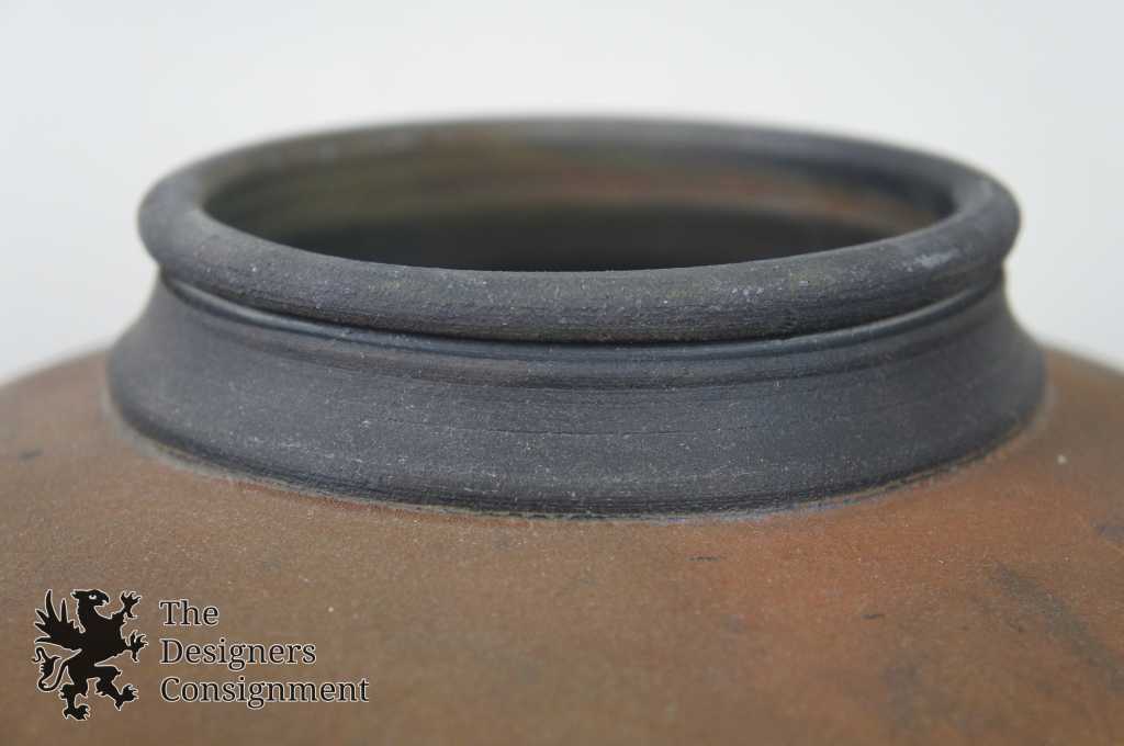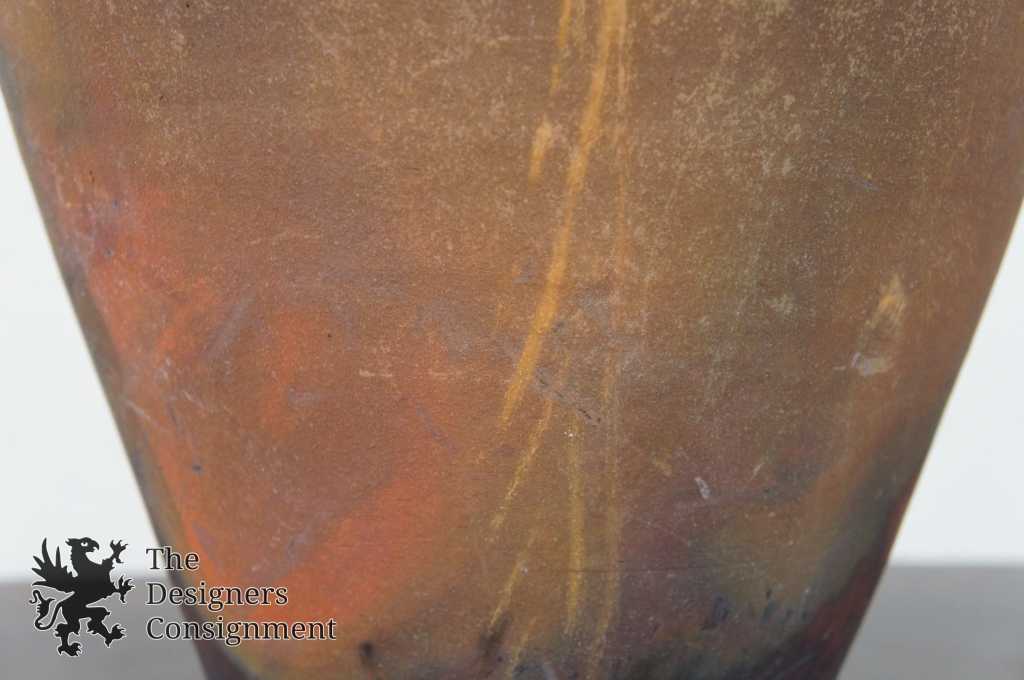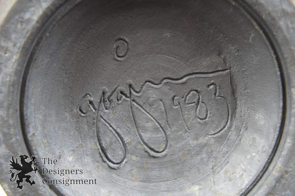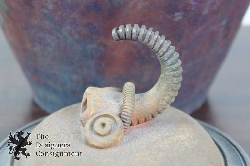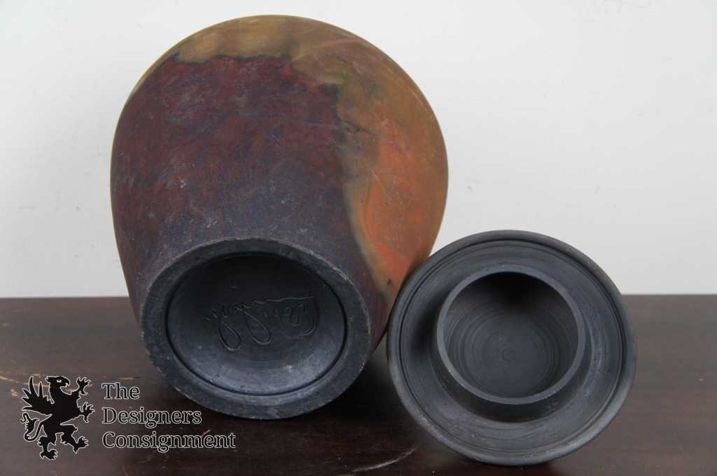 Raku Pottery Jar or Vase. Beautifully detailed with purples and greens. Lid features a unique figural deisgn. Signed along the bottom 1983. We cannot discern the artists name
