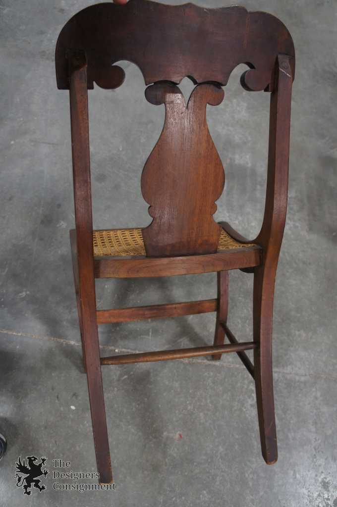 Mid 19th century Empire dining chairs. Made from walnut with crotch walnut back support and cane seat.