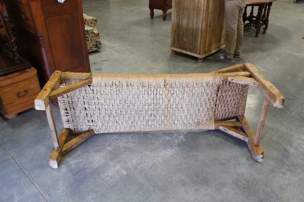 The Charpoy is a traditional woven bed that has been used in India since the middle ages. This beautiful example was made in late the 19th century with solid distressed posts. It features an arched head support and is neatly woven with Jute fiber. Perfect for use as chaise or day bed.