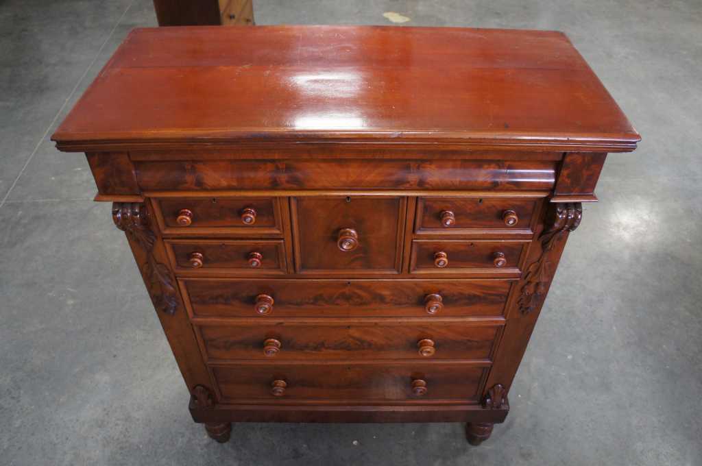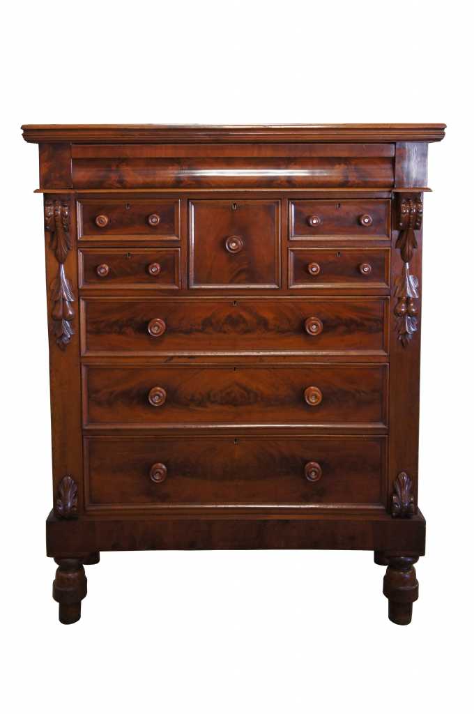 An exceptional example of Welsh craftsmanship. This monumental Empire chest of drawers draws you in again and again. Made from flame mahogany with extraordinary wood grain and beautifully scrolled acanthus carvings. There are 9 drawers offering sufficient storage including one towards the top made specifically for hats. The chest rests upon 4 turned legs. Circa 1850s. An astonishing piece of furniture that will add beauty and grandeur to any space.